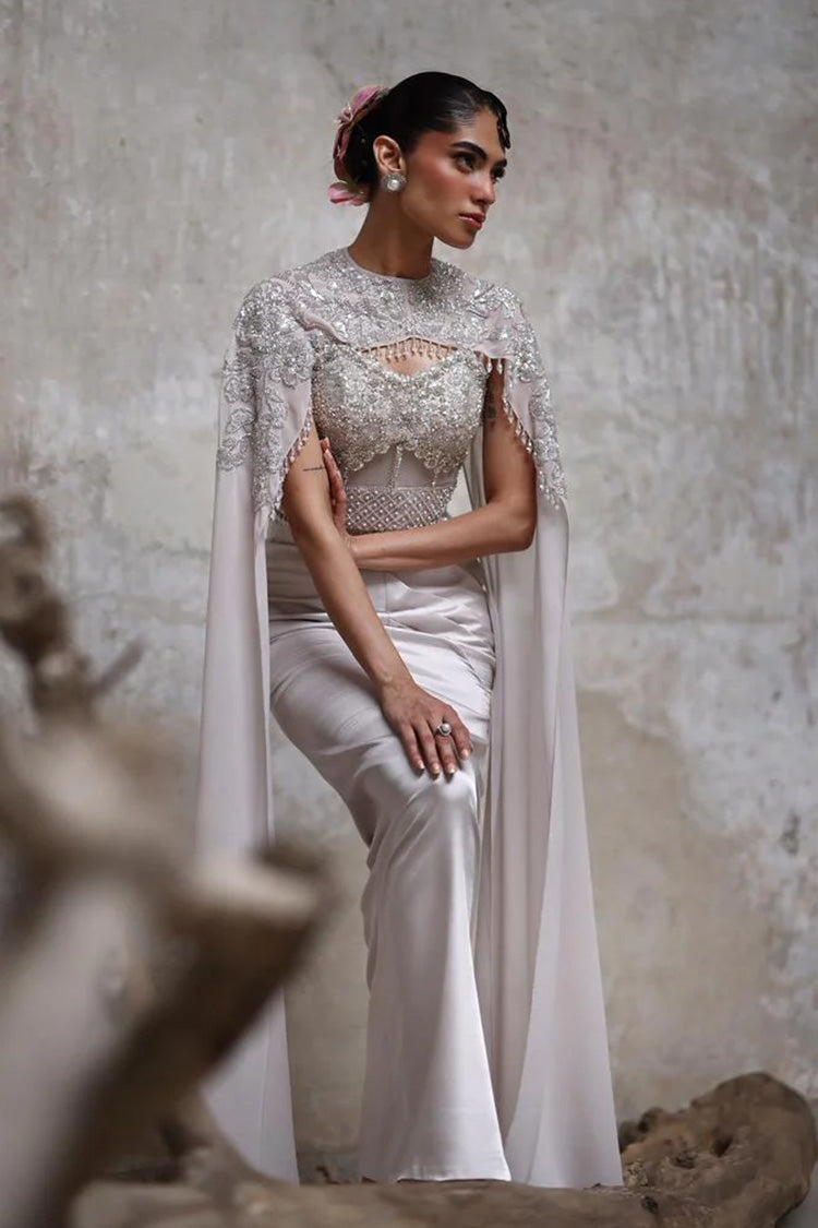 Off White Gown With Cape Sleeves Jacket (RO2007)