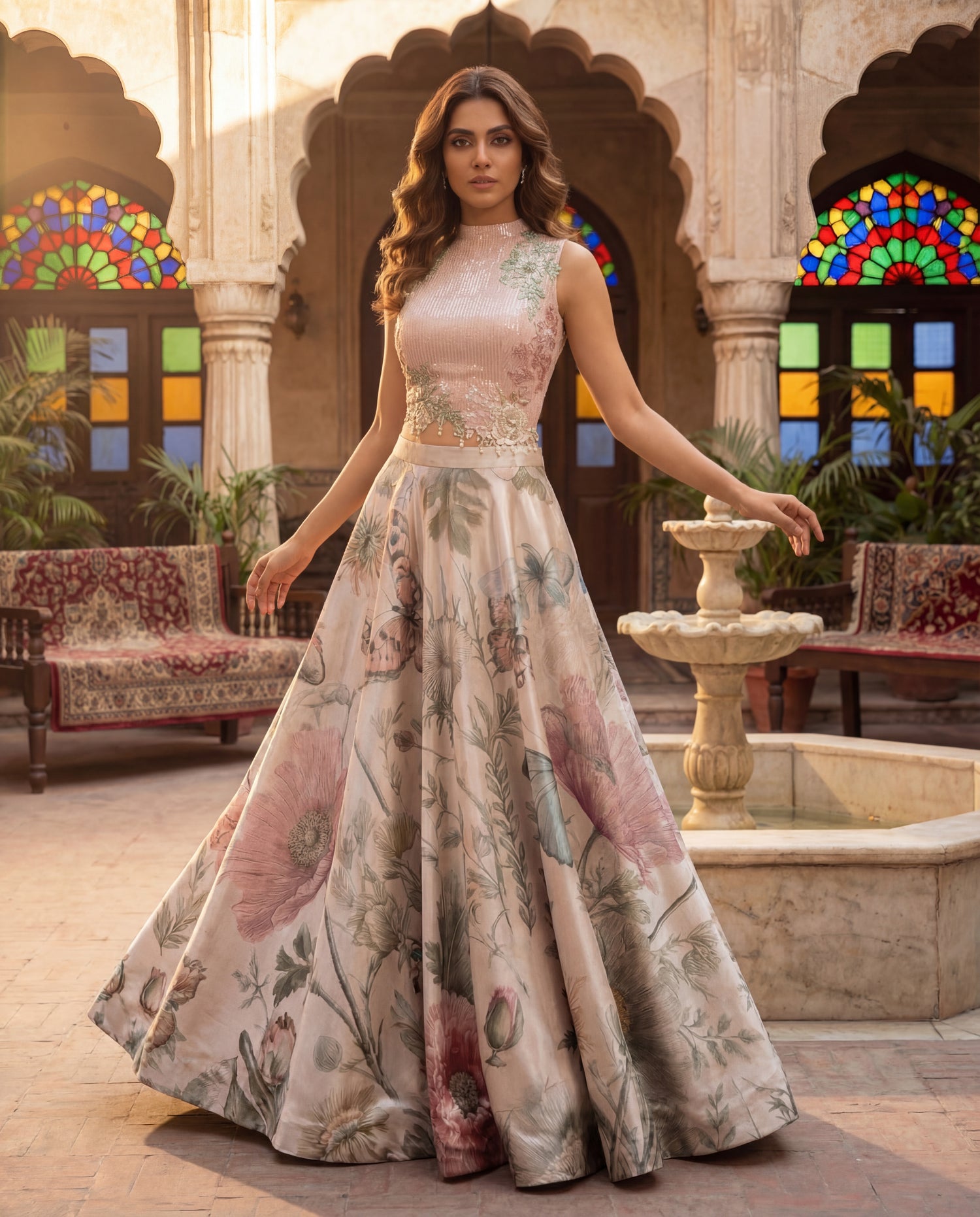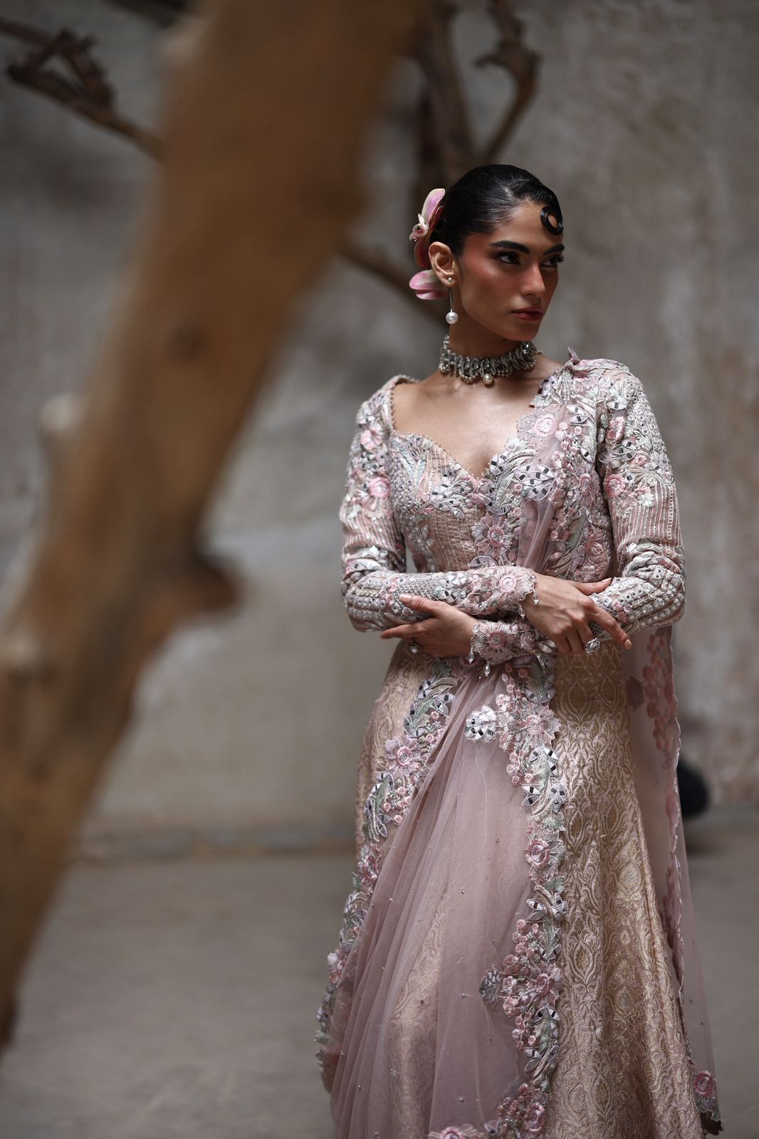 Introducing a dusty beige, organza, floral cutwork peplum. A testament to unparalleled...