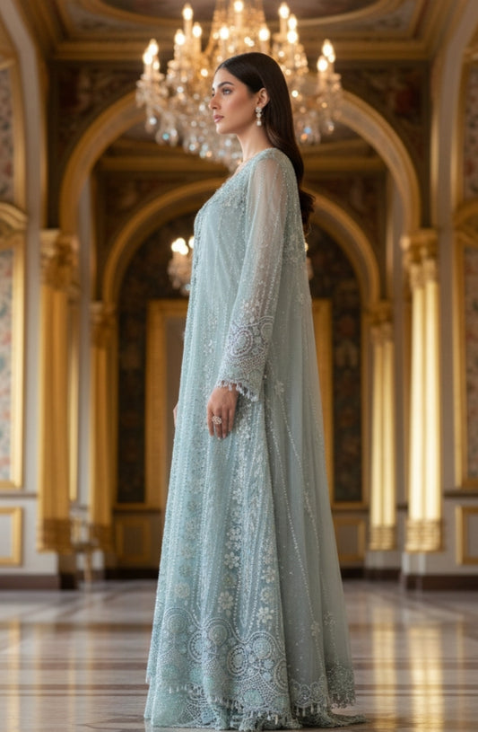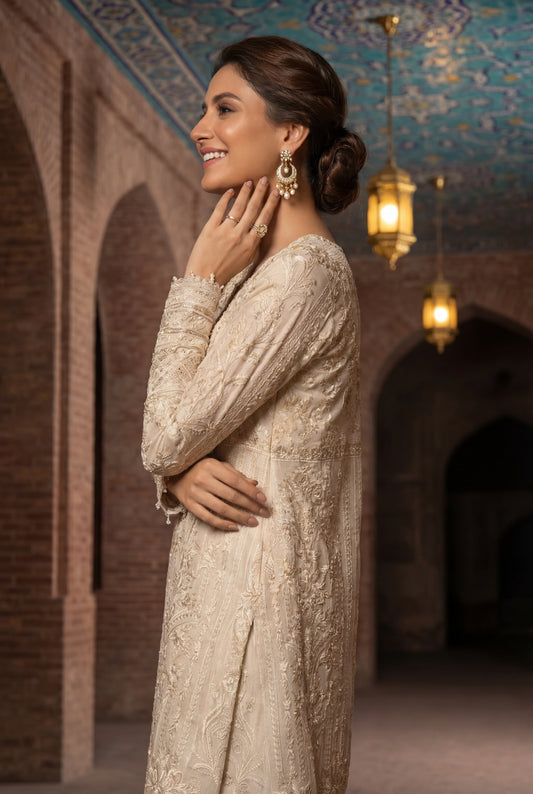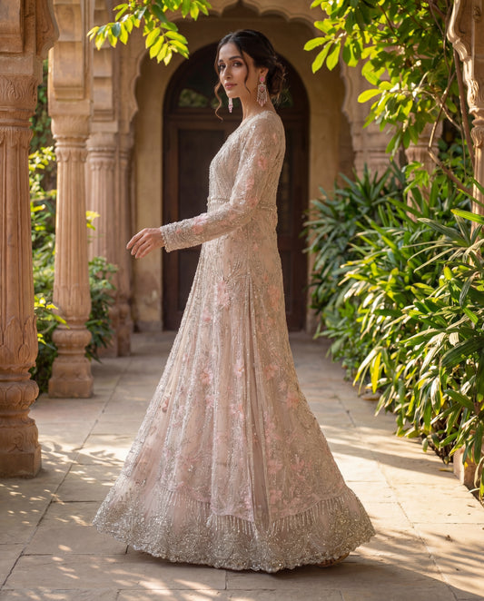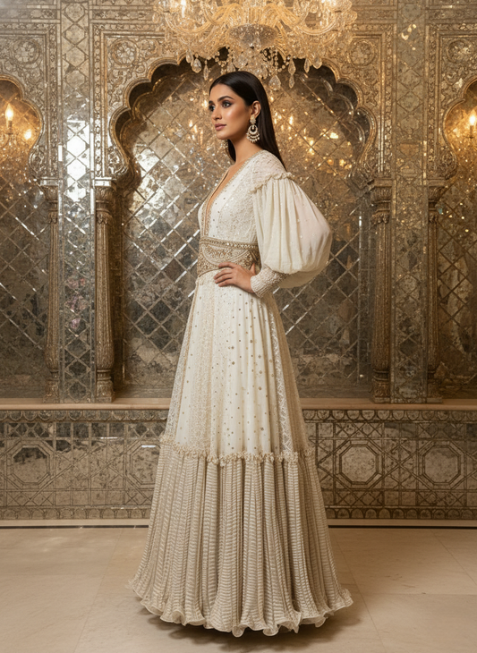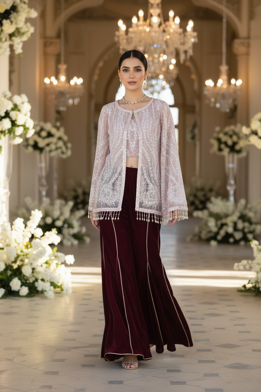 At Rozinaa, you will come across some of the most unique, designer ethnic jackets for ladies that you cannot just say no to. Our off-white Mukaish kalidar jacket is a classic piece if you are looking for a glamorous ethnic jacket for lehenga. Another statement ethnic jacket for lehenga is our off-white tassel jacket. You can pair up this magnificent piece with a bright pink or an emerald green lehenga. A golden lehenga with this jacket would definitely make heads turn. Our serene blue embroidered cape jacket is yet another statement piece that would be a perfect addition to your gown.