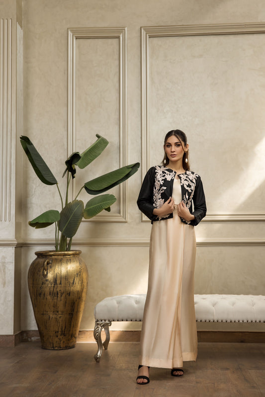 Introducing a dusty beige, organza, floral cutwork peplum. A testament to unparalleled luxury. Immerse yourself in sheer opulence with this stunning piece, it is adorned with meticulous thread and zari embroidery, depicting an intricate botanical design. It is paired with a pair of beige silk pants.