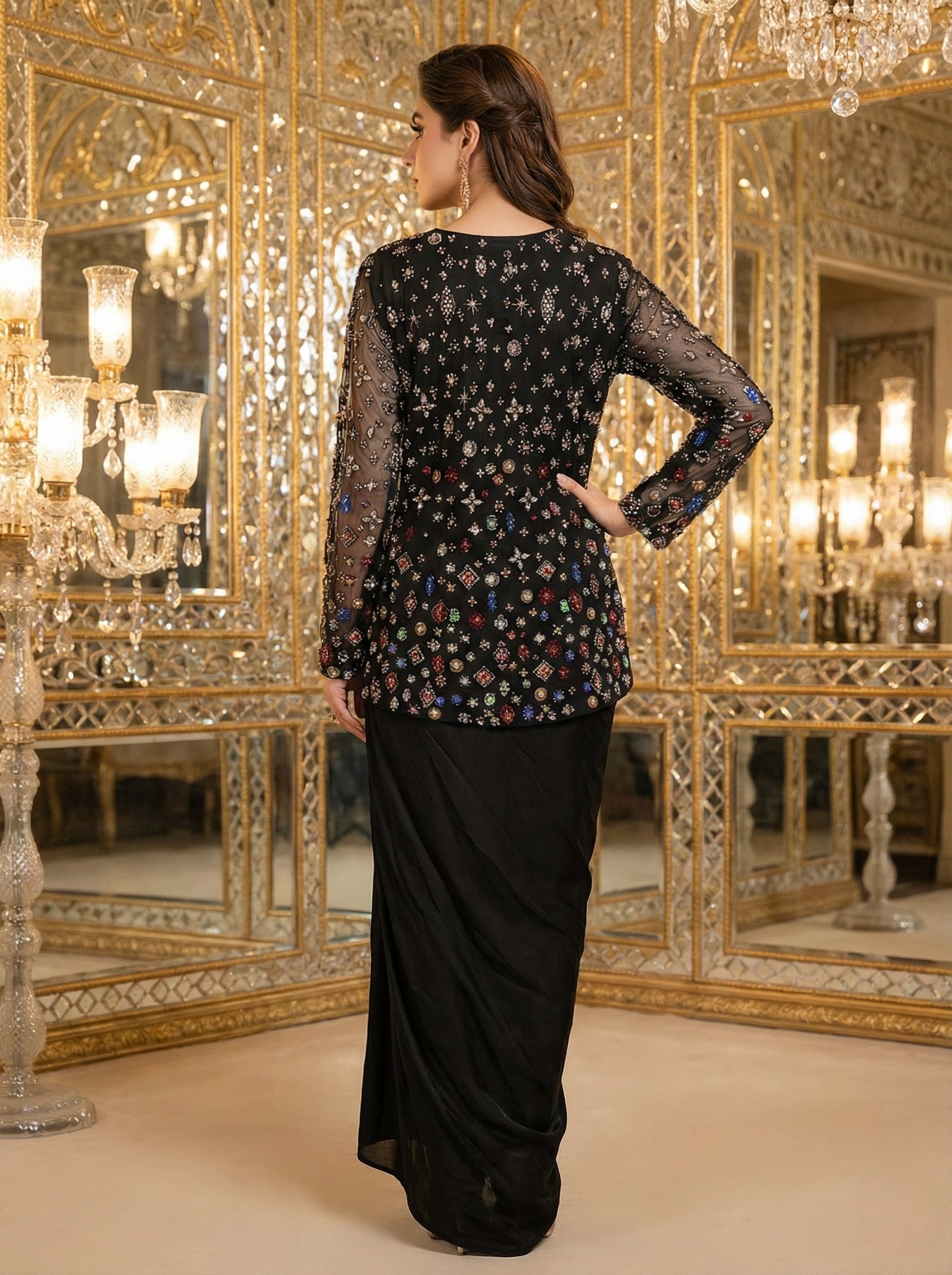 This striking ensemble features a black net jacket, intricately adorned with multicolour crystal hand embroidery that glistens with every movement. The sheer sleeves and delicately embellished motifs add a modern, luxurious charm, while the structured silhouette keeps the look refined and elegant. Paired with a black georgette drape skirt, the outfit flows effortlessly, creating a graceful, elongated form. The lightweight georgette fabric drapes seamlessly, balancing the rich embellishment of the jacket with soft, fluid movement.