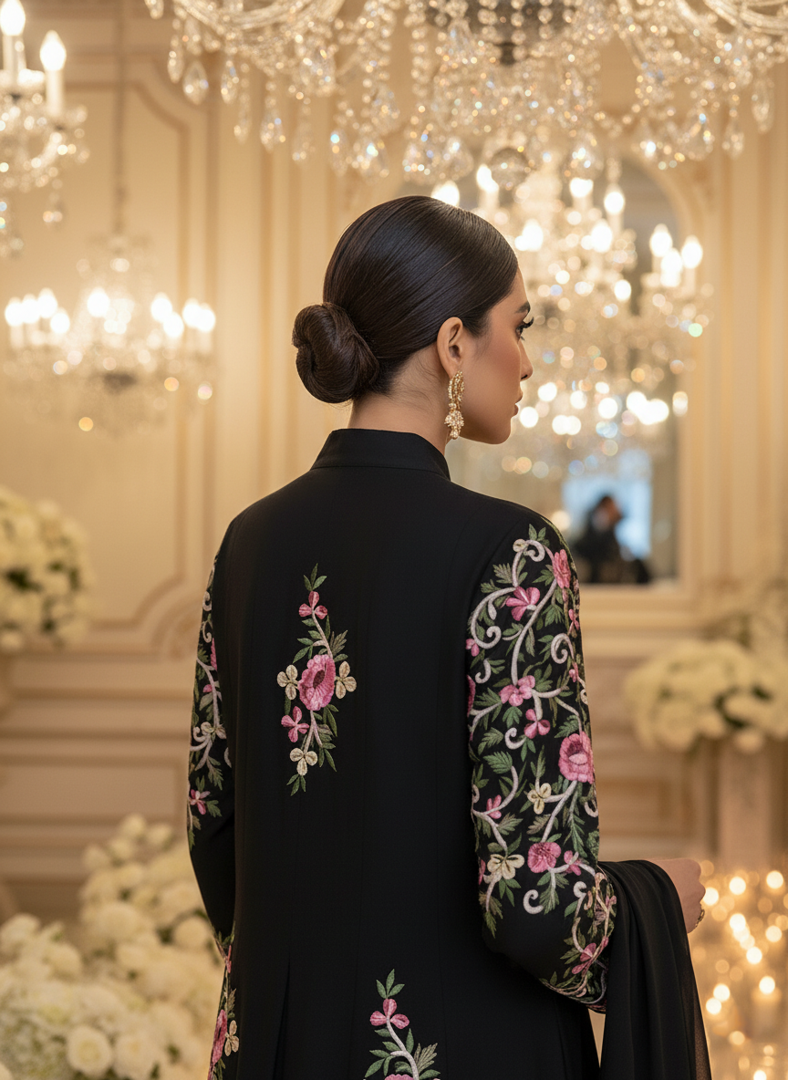 A beautifully embroidered, Swiss cotton kurta set with resham embroidery, it is teamed with a georgette dupatta with embroidered botis and finished with mirror work edging. A pair of well tailored silk pants with organza and mirror work detailing finishes the outfit!
