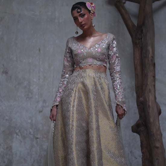 A luxurious amalgamation of a sculpted silhouette, decadent details and sensual textures in our organza embroidered choli that showcases mesmerising cutwork details and celestial mirror embellished with sequins and tassels. Pair it with a stunning brocade ghagra with a graceful flair! The net dupatta is adorned with delicate borders and tikki stones and pearls creating a lavish ensemble!