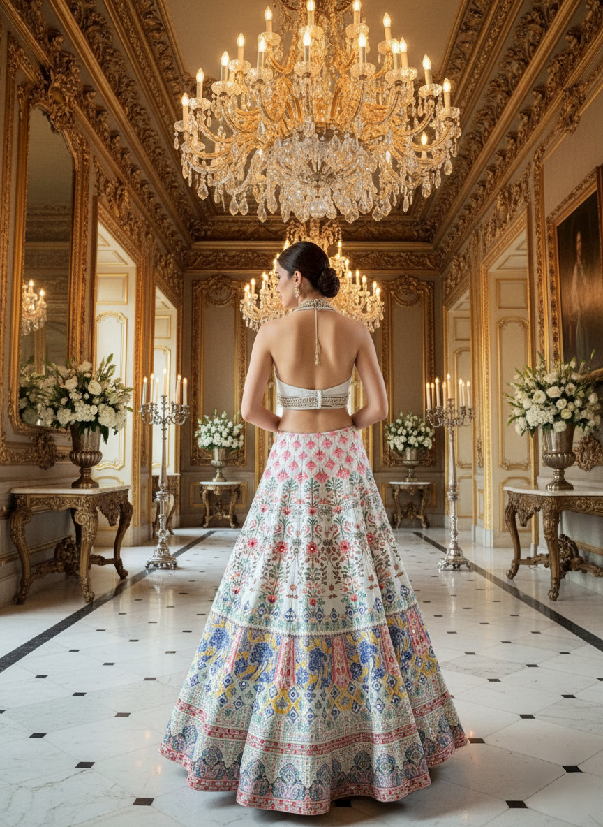 A luxurious amalgamation of a sculpted silhouette, decadent details and sensual textures in our beautiful silk printed skirt and choli set. The print is highlighted with a combination of pearls, crystals and sequins embroidery. The blouse is adorned with beautiful pearl and crystal embroidery on the neckline creating a lavish look!