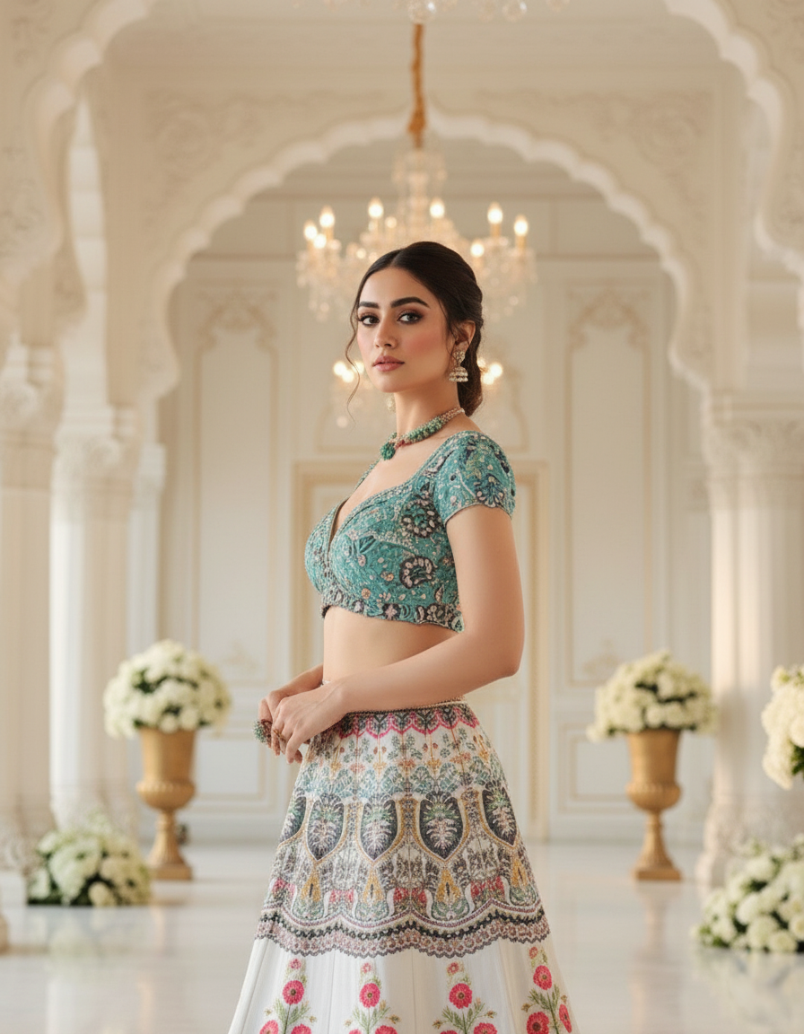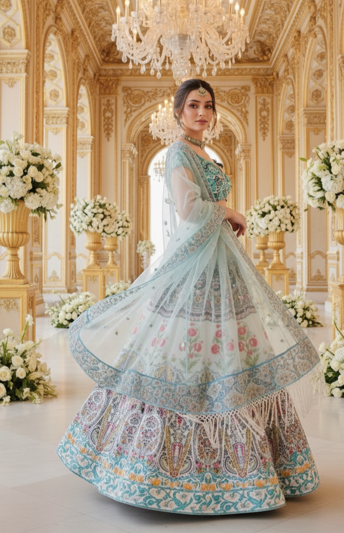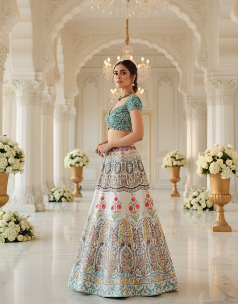 A luxurious amalgamation of a sculpted silhouette, decadent details and sensual textures in our beautiful silk printed skirt and choli set. The print is highlighted with a combination of crystals and sequins embroidery. The beautiful choli is adorned by heavy poth hand embroidery. It goes beautifully with a printed organza dupatta that is finished with fringes creating a lavish ensemble!