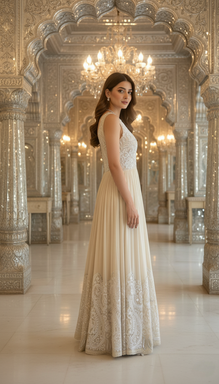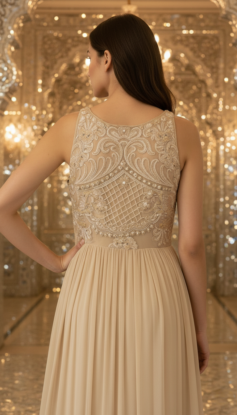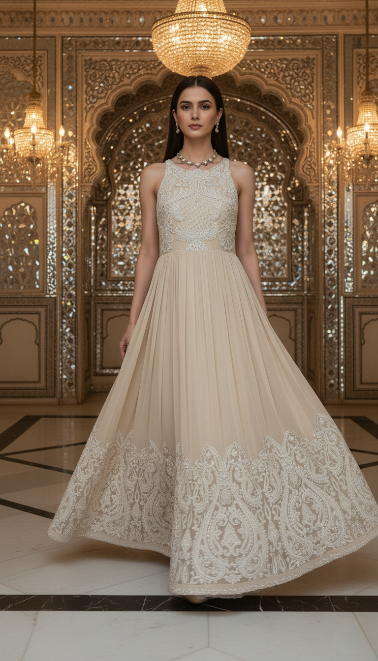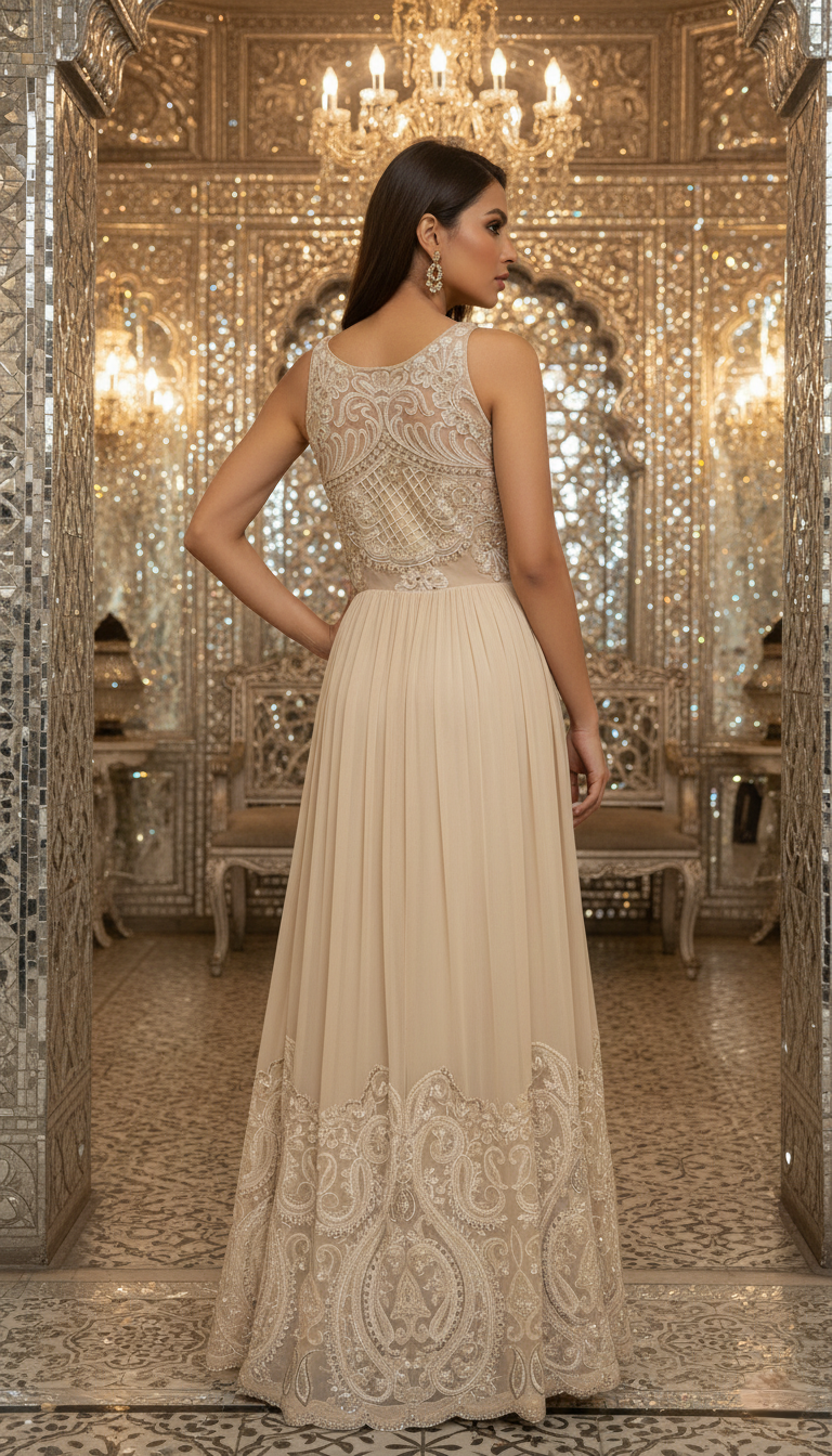 An elegant georgette gown designed with a graceful double layered silhouette. The bodice is delicately adorned with intricate appliqué work on sheer net, adding texture and depth, while the flowing georgette skirt moves effortlessly with every step. Finished with detailed appliqué accents along the hem, this gown exudes understated luxury perfect for receptions, evening celebrations, and formal occasions.