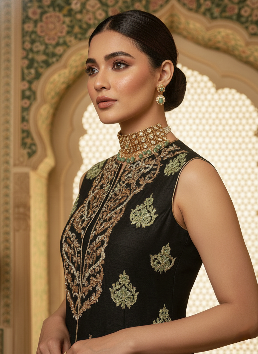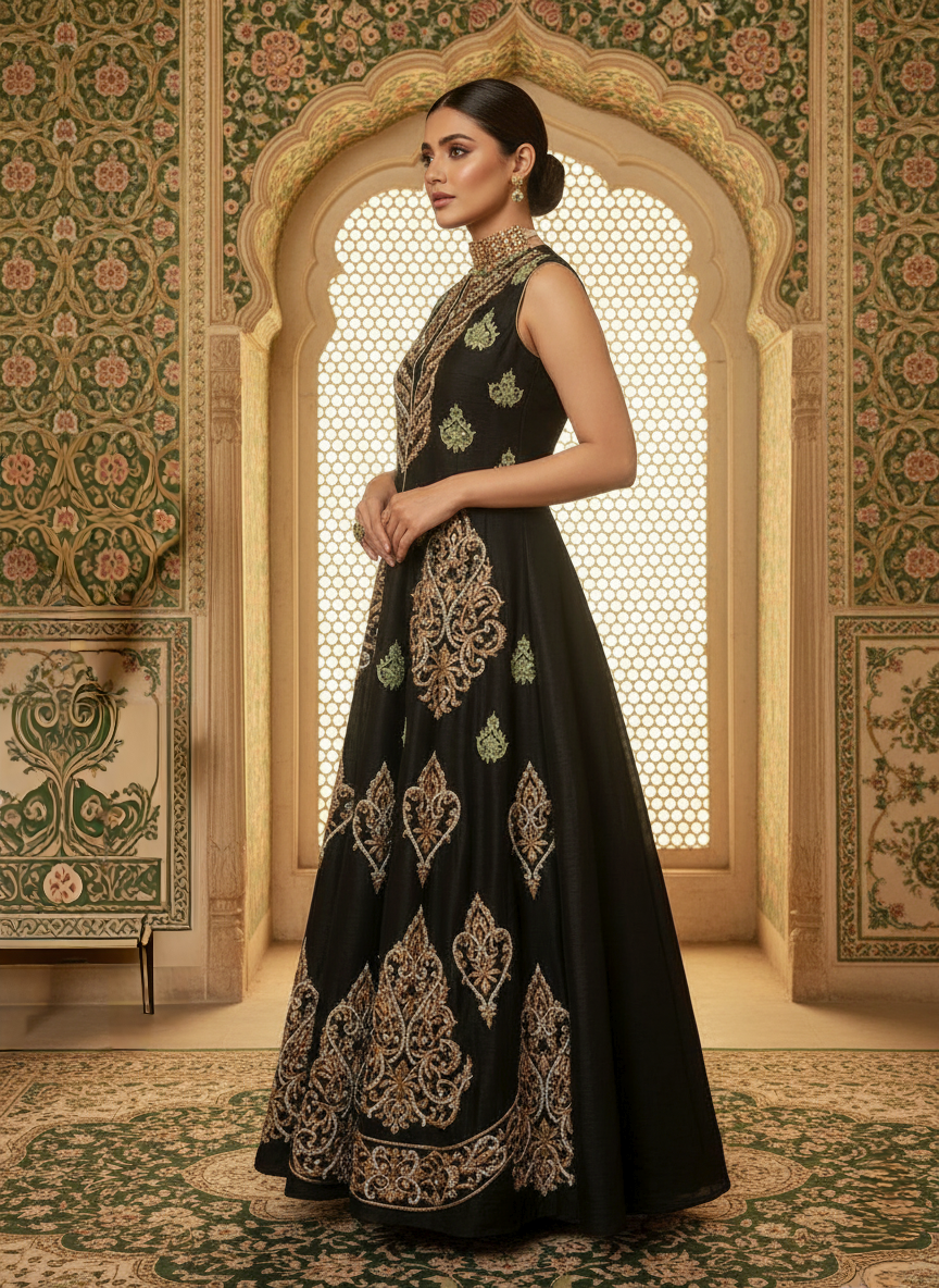 A vision of timeless craftsmanship and modern grace. Each ensemble is an ode to luxury, woven with rich textures, intricate embroidery and delicate embellishments that reflect the essence of refined elegance. Designed for woman who carry sophistication effortlessly. This beautiful silk, black jacket set is embellished with gold zardozi handwork and pista green resham embroidery. It comes with a black long Kalida inner. This ensemble celebrates artistry, confidence and the luminous beauty of formal wear redefined!