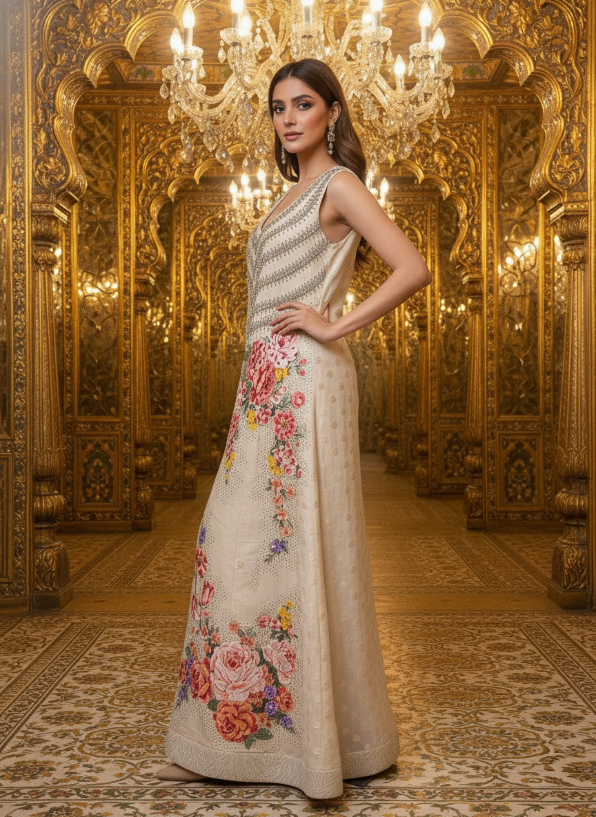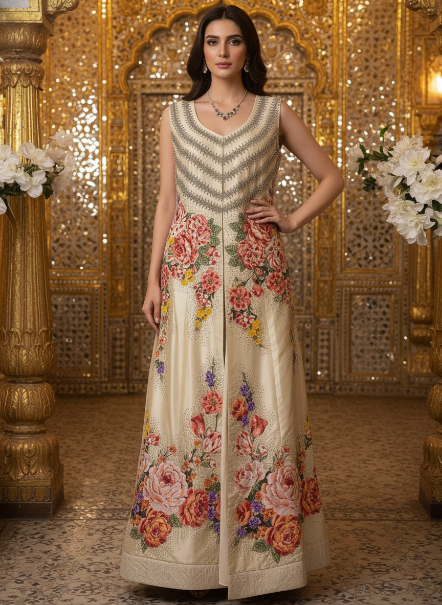 An opulent Dupion silk jacket, crafted in a luminous ivory tone and elevated with intricate gold hand embroidery cascading in chevron formations across the bodice. Exquisite floral patchwork blooms along the panels, rendered in rich, painterly hues that create a striking interplay of texture and colour. Each motif is meticulously embellished with fine resham, sequins, and beadwork, lending a sculpted, couture finish. The silhouette is timeless yet modern, celebrating artisanal craftsmanship with a romantic, heirloom worthy elegance. Exquisite Banarasi inspired detailing enriches the back, adding depth and a regal textile dimension to the piece. The look is completed with a fluid, full length crepe gown inside, creating a graceful fall and elevated movement.