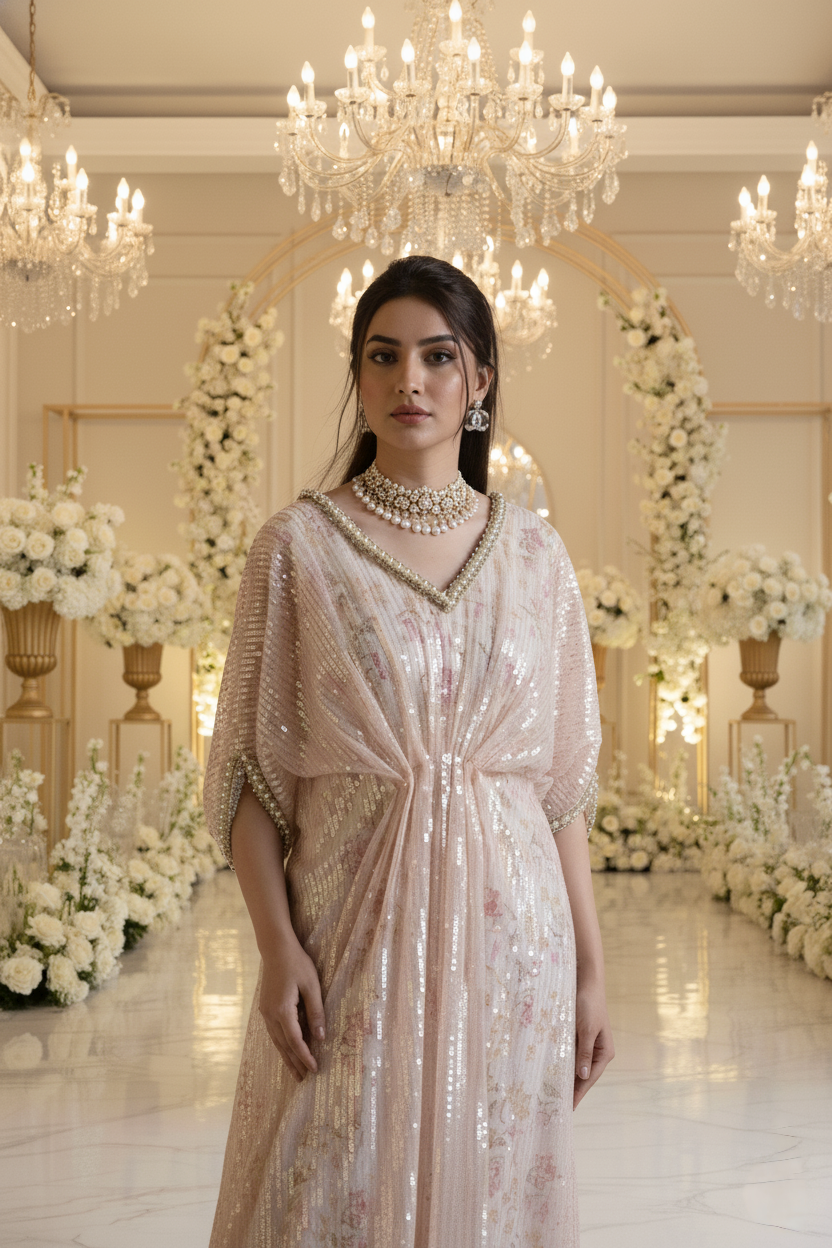 Indulge in luxury in our stunning net embroidered kaftan with a printed inner designed to make you feel like royalty. The intricate detailing of cut dana and sequins adds a touch of glamour, while the pearl-embellished lace on the neckline and sleeves exudes sophistication and style.
