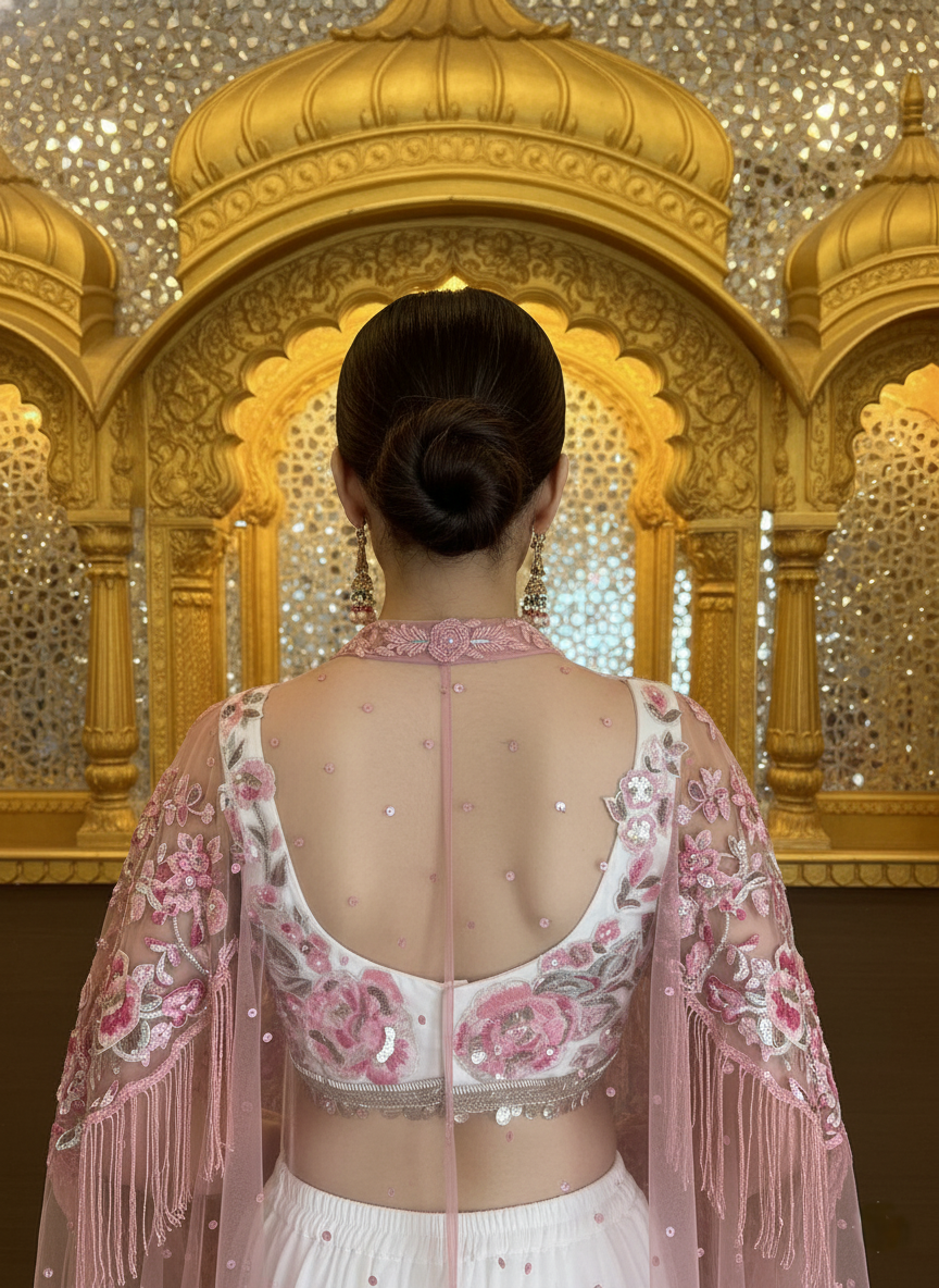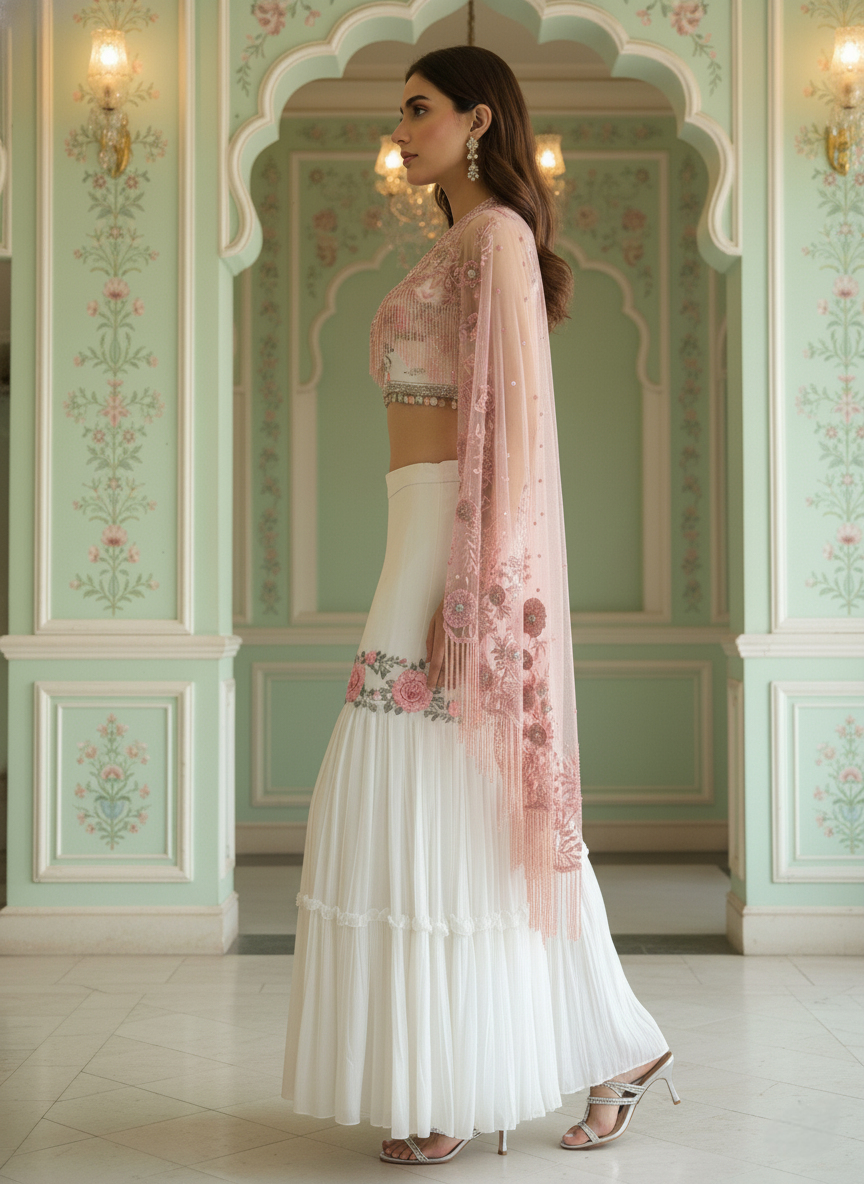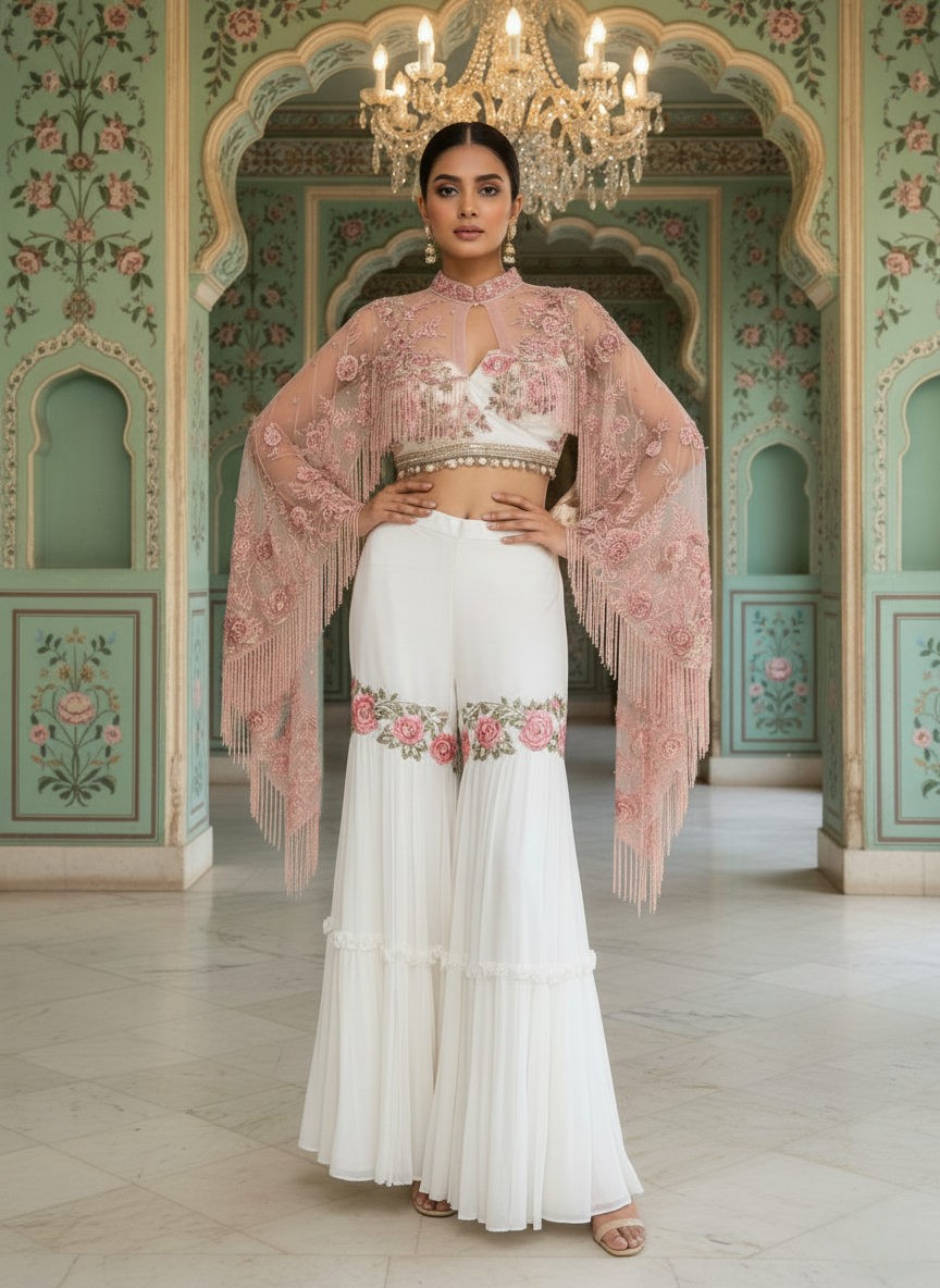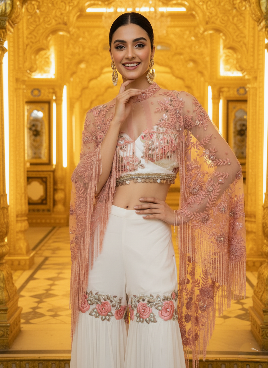 A dreamy rose-pink embroidered ensemble featuring fluid georgette ruffled palazzos, adorned with a delicate hand embroidered floral border in soft pinks and greens. The look is paired with a beautifully crafted embroidered blouse, highlighted with shimmering sequins and thread work roses for an ultra feminine finish. Completing the set is an ethereal net cape in rose pink, lavishly embellished with intricate hand embroidery, floral appliqué, and cascading tassels that add graceful movement. Elegant, romantic, and statement making perfect for intimate celebrations, cocktails, and festive occasions.