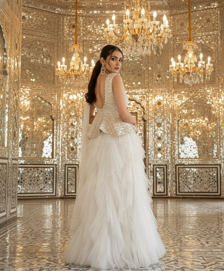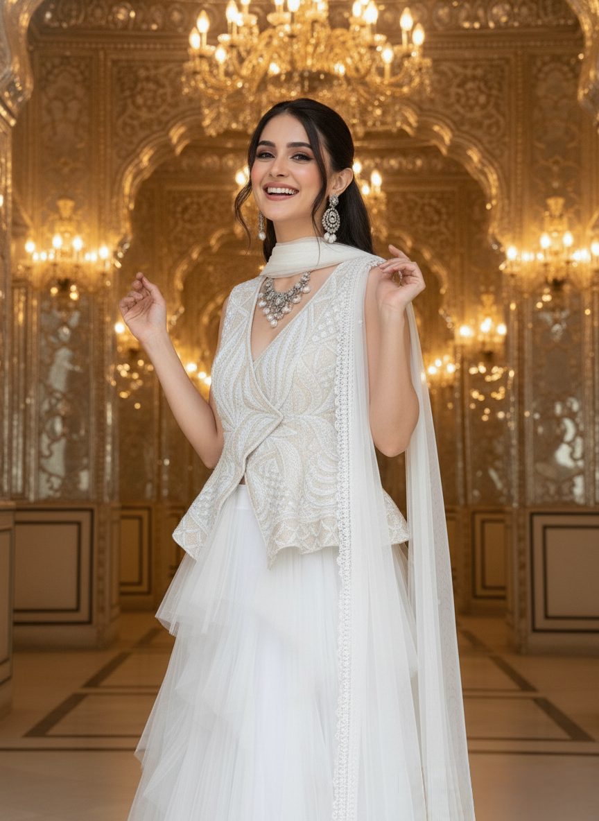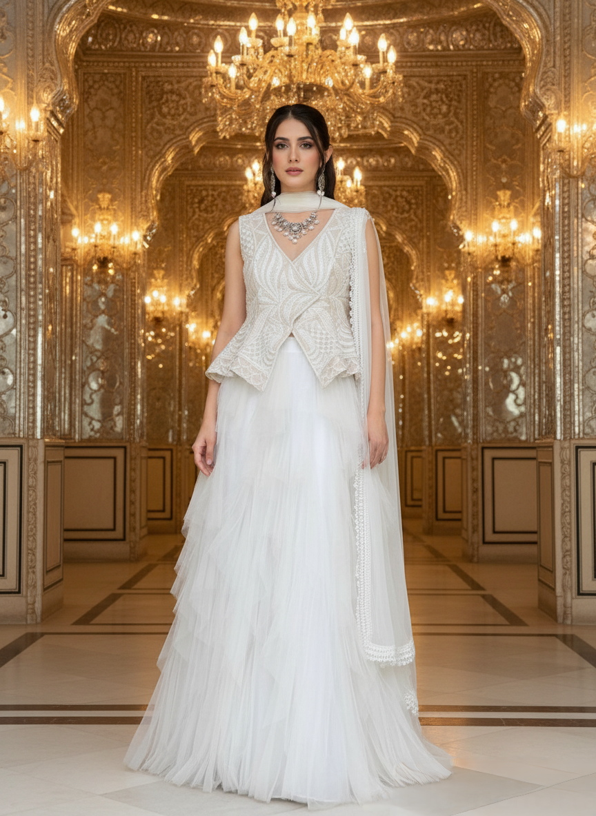 A vision of pure sophistication, this couture ensemble captures the poetry of movement and the precision of artisanal craftsmanship. The look features a voluminous layered net skirt, sculpted in soft cascading tiers that create an ethereal, weightless silhouette gliding with every step like drifting tulle clouds. Balancing the dreamy fluidity below, the structured peplum bodice is a masterpiece of hand embellishment. Hundreds of delicately placed beads trace organic, architectural patterns across the cream surface, forming a sculpted shape that cinches the waist with impeccable couture finesse. The meticulous beadwork executed by skilled artisans adds depth, dimension, and a luminous sparkle that refracts elegantly under ambient light. Finished with a sheer, pearl-edged drape that falls effortlessly over the shoulder, this ensemble harmonizes romance with modern refinement. The result is a piece designed for the woman who embraces subtle grandeur an unforgettable statement for weddings, receptions, and evenings defined by timeless beauty.
