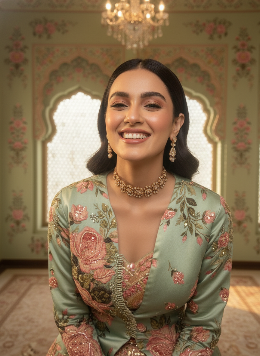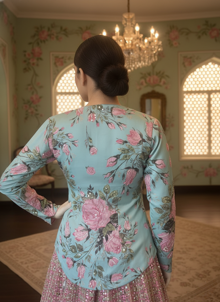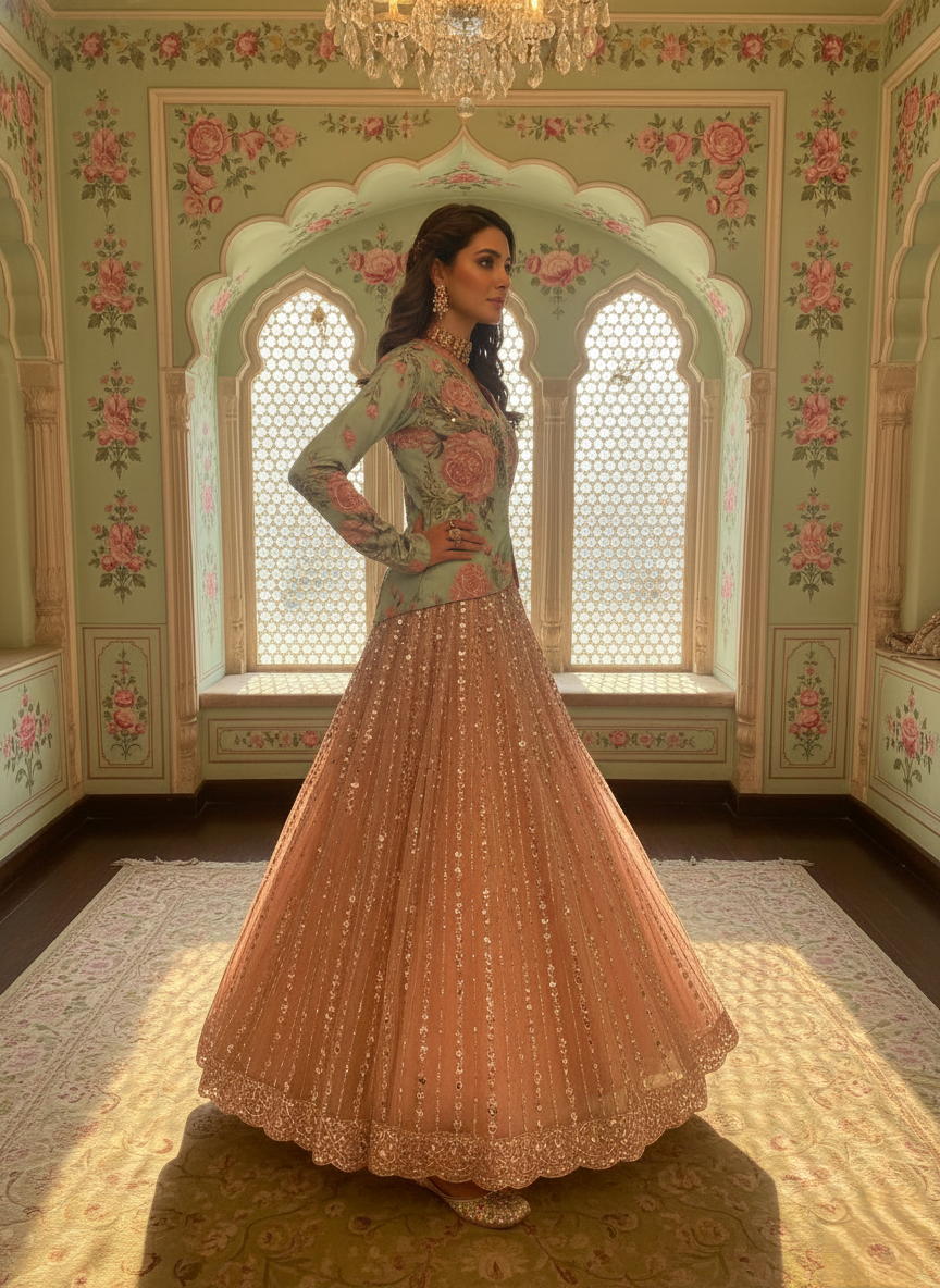 A symphony of shimmer and sophistication, this silicon silk peplum set is a true ode to contemporary craftsmanship. The printed peplum blouse is delicately adorned with sequin highlights and fine bead embroidery, paired with a beautifully coordinated choli beneath that mirrors the intricate beadwork of the ghagra. The layered silhouette adds depth and movement, while the richly embroidered skirt exudes opulence and grace. Designed to flatter the form with its sculpted waist and fluid drape, this ensemble captures timeless elegance with a modern, festive flair — perfect for wedding celebrations, soirées, and special occasions.