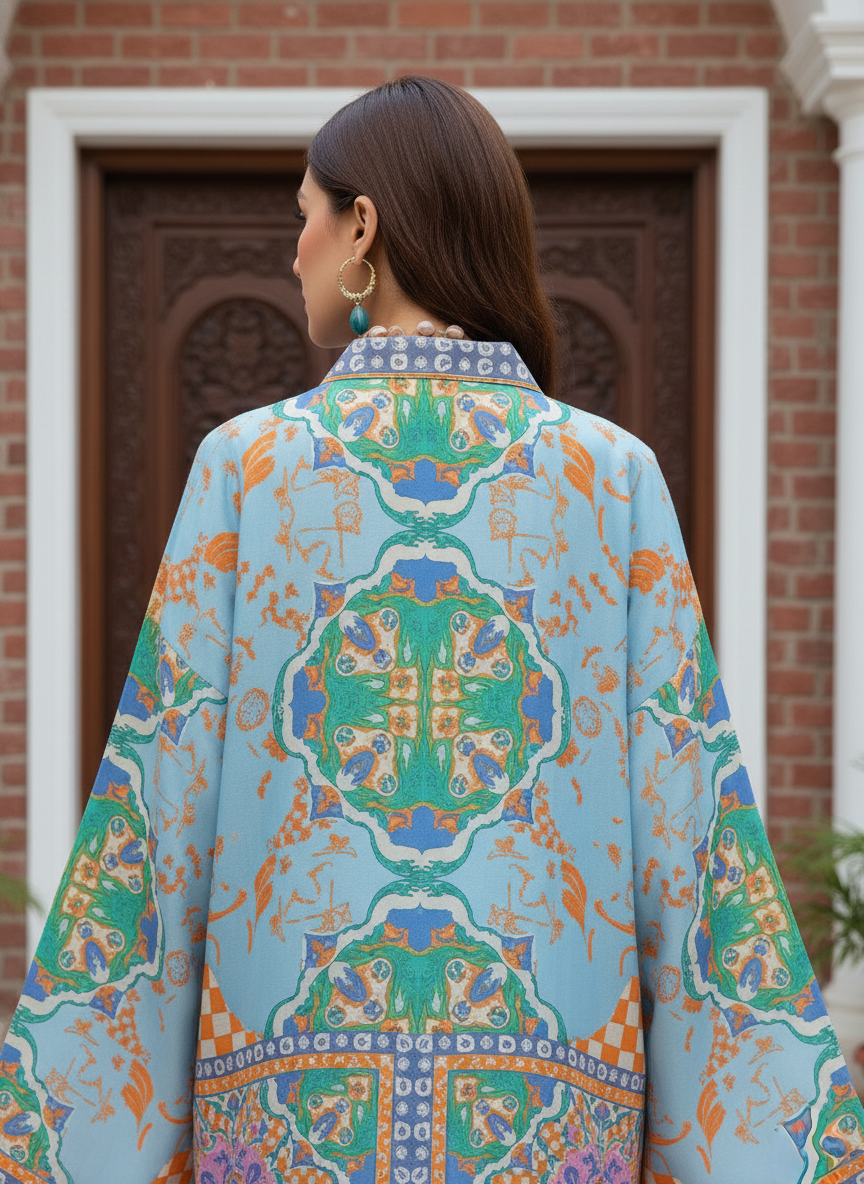 Crafted in luxurious viscose silk, this striking blue set features an intricate multicoloured print inspired by artistic motifs. The collared kurta, with its relaxed silhouette and statement sleeves, blends comfort with contemporary elegance. Paired with matching straight pants highlighted with printed borders, this ensemble exudes effortless sophistication perfect for daytime occasions or refined festive gatherings.
