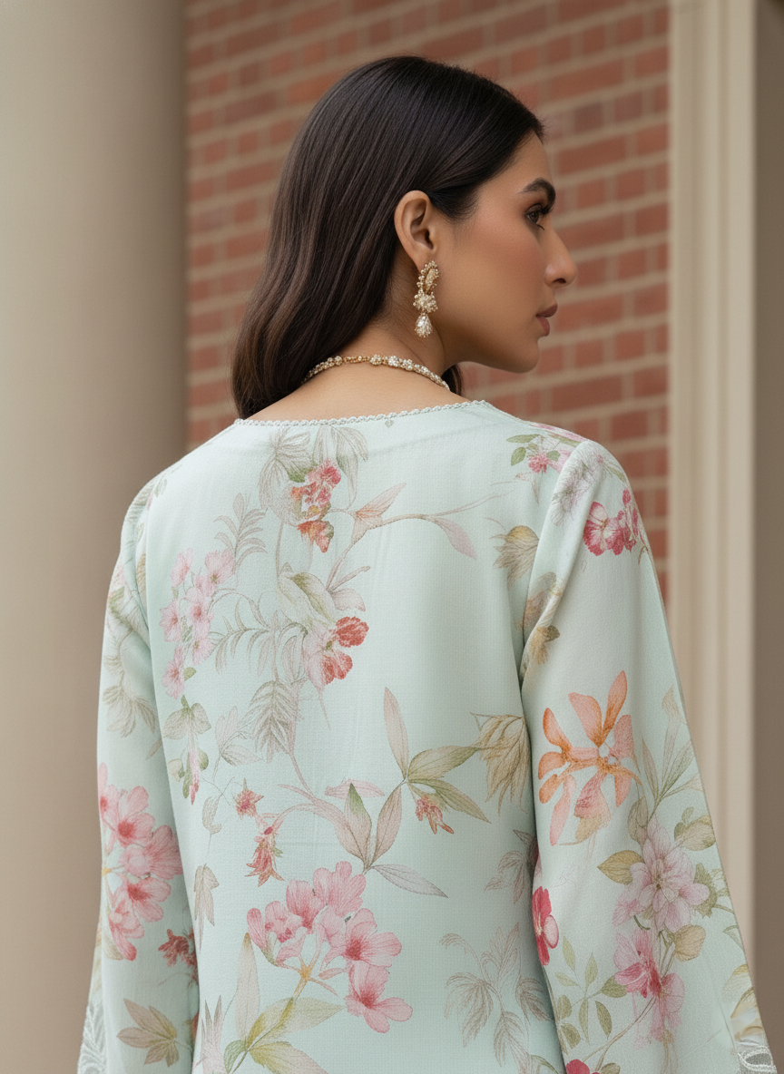 This exquisite ensemble features a soft pastel palette of mint and blush, crafted in luxurious viscose silk. The kurta showcases delicate floral prints accented with intricate lace detailing on the sleeves and hem, lending it a touch of timeless elegance. Paired with matching printed pants, this set blends effortless sophistication with serene charm — perfect for daytime celebrations or refined evening gatherings.