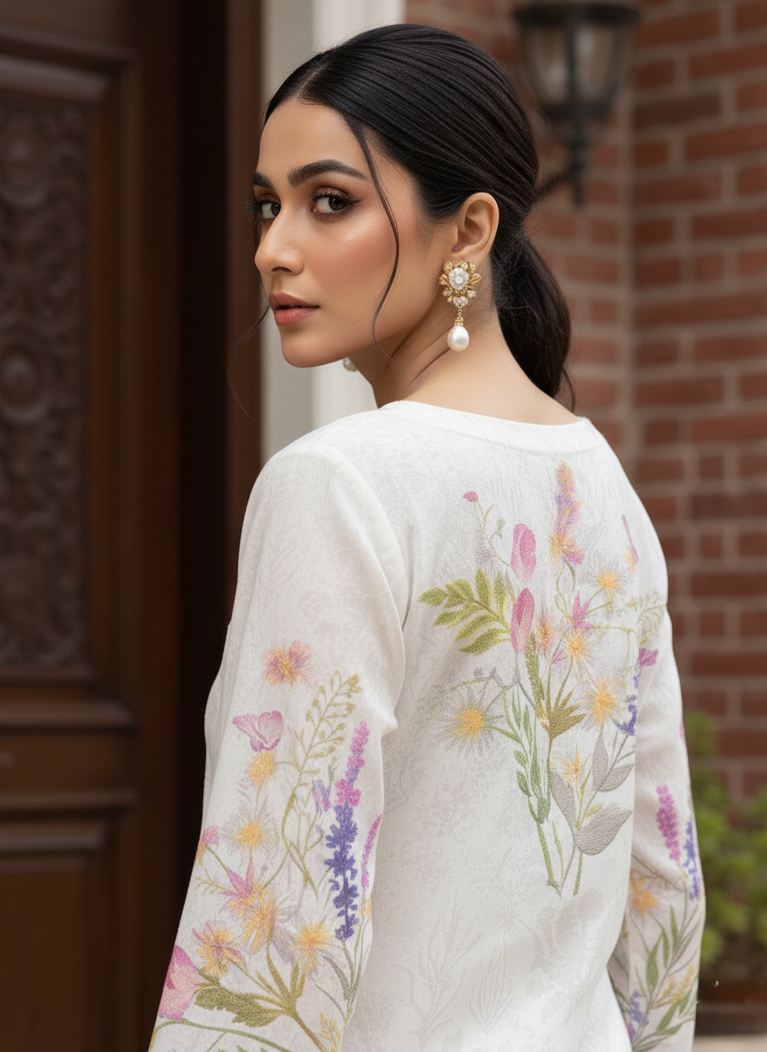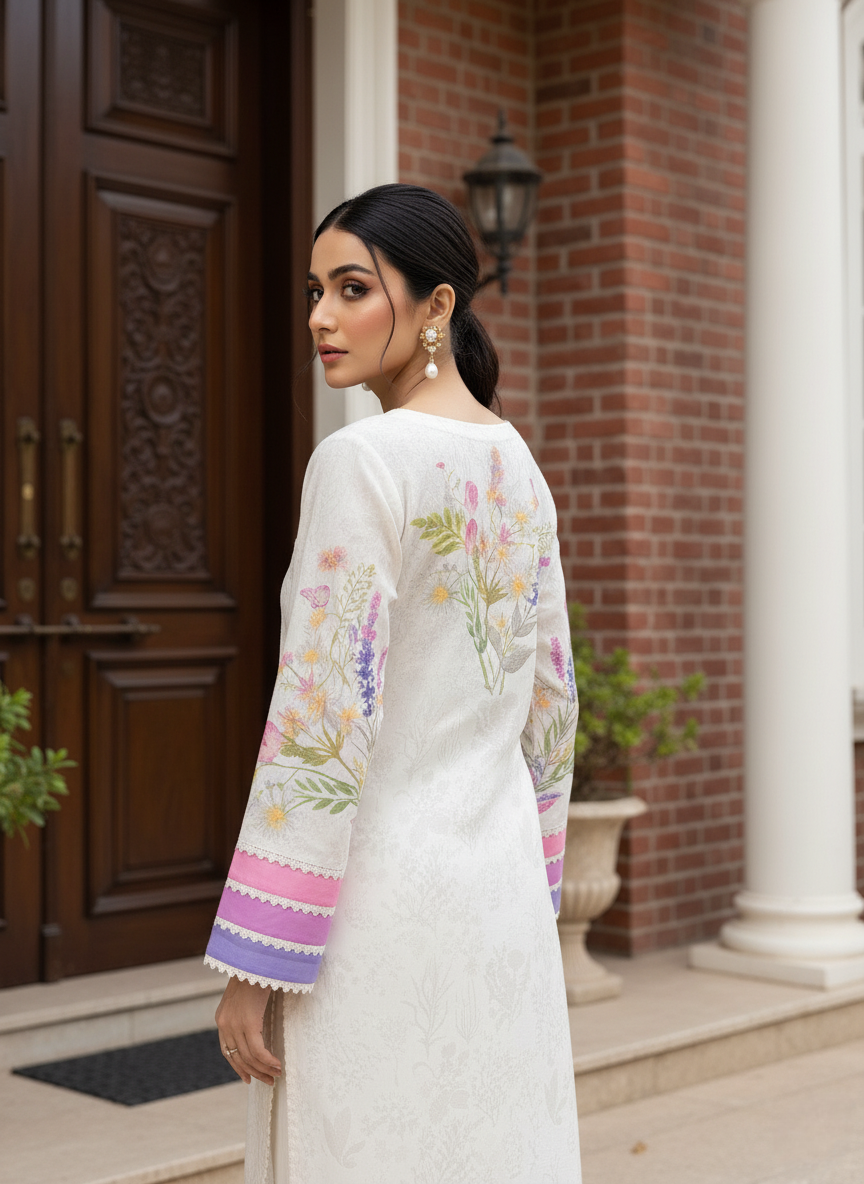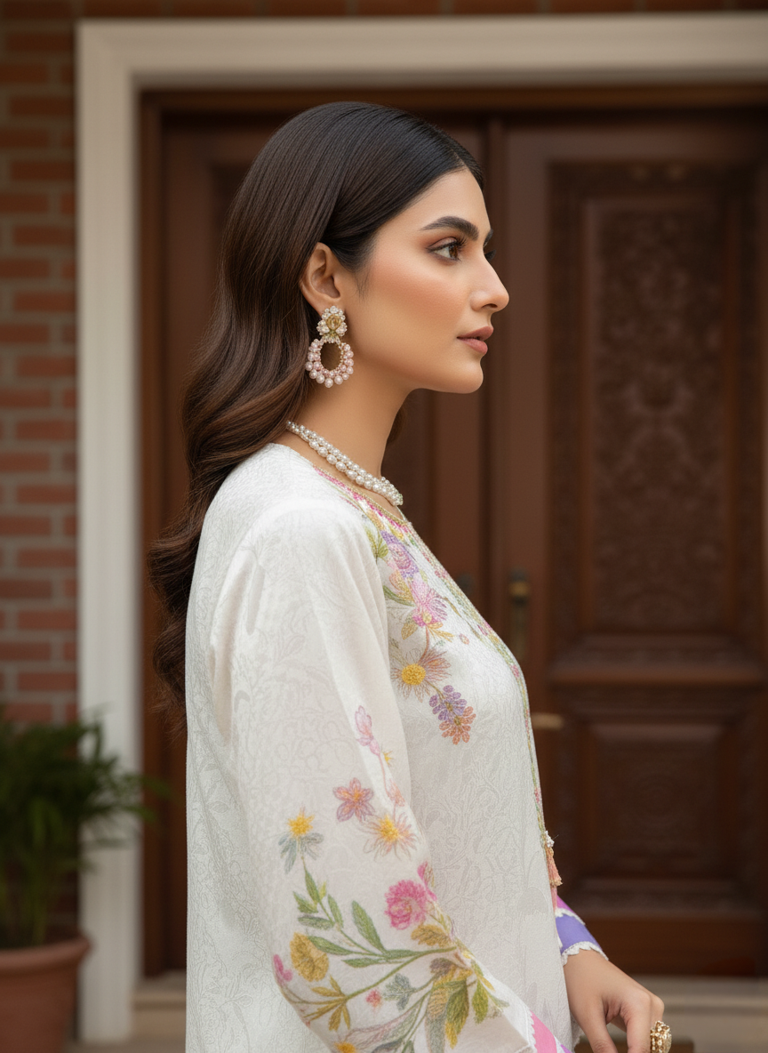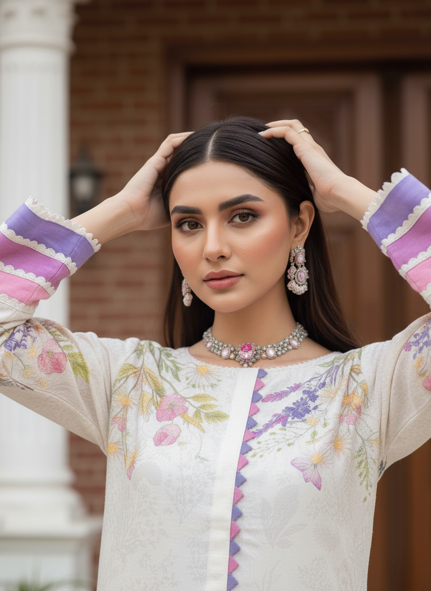 Grace meets modern sophistication in this exquisite white viscose silk kurta set. Crafted from luxuriously smooth fabric, the ensemble features delicate pastel floral prints that exude elegance and femininity. The straight-cut kurta is enhanced with a refined round neckline, intricate lace accents, and statement sleeves detailed with soft hues of pink and lavender for a contemporary edge. Paired with coordinated printed trousers, this set offers effortless charm and all-day comfort perfect for festive luncheons, elegant gatherings, or daytime celebrations