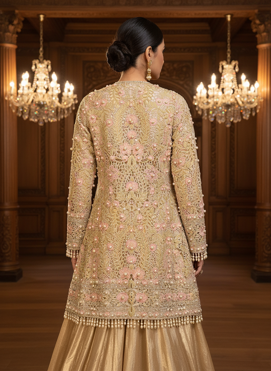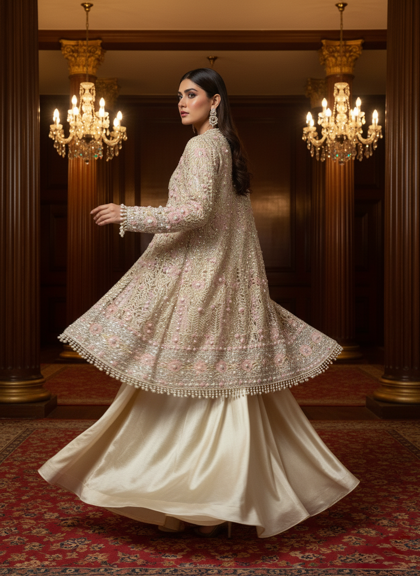 A vision of timeless craftsmanship and modern grace. Each ensemble is an ode to luxury, embroidered with thick textures, intricate embroidery and delicate embellishments, that reflect the essence of refined elegance. This jacket, skirt and blouse celebrates artistry, confidence and the luminous beauty of formal wear refined!