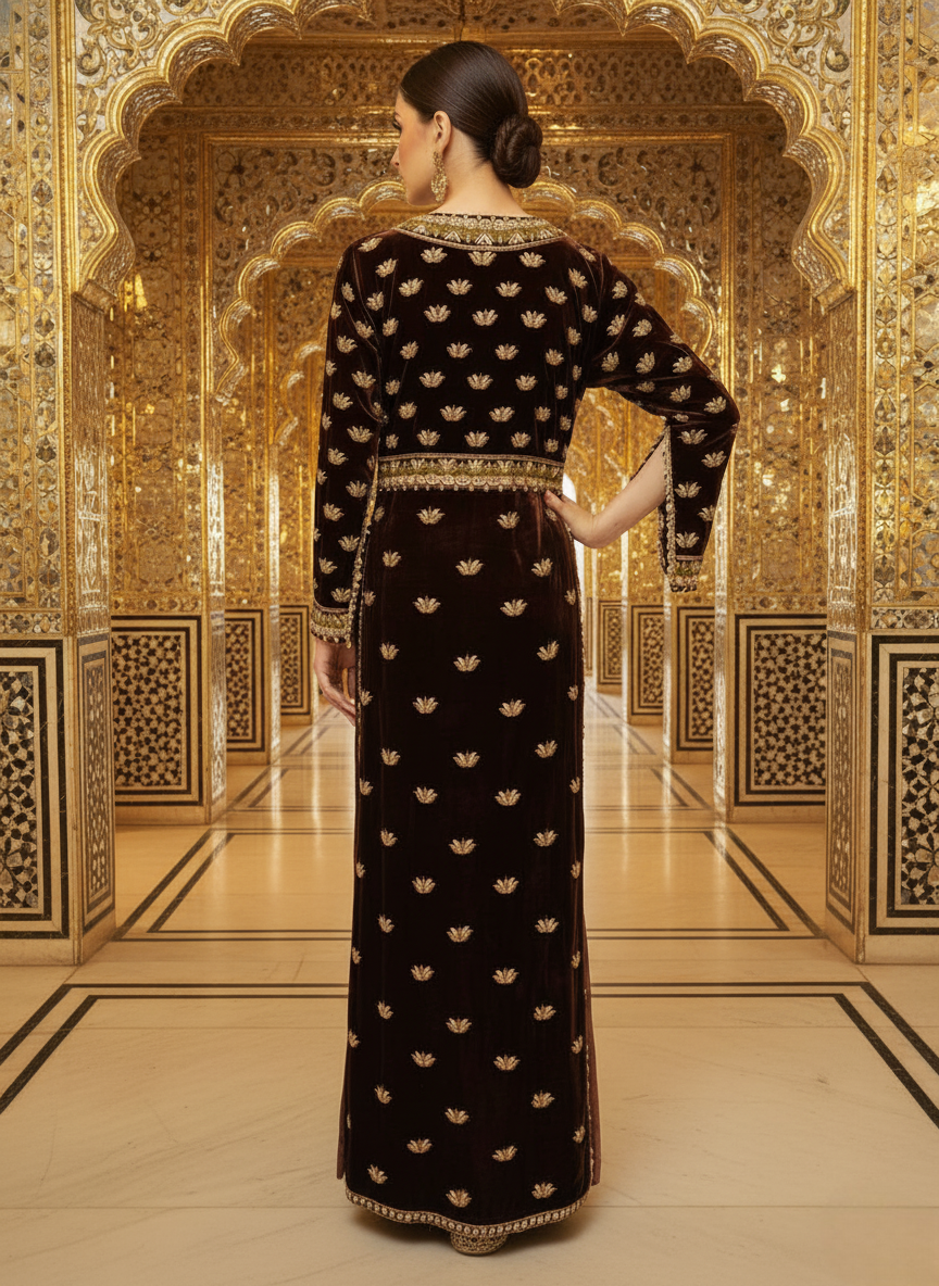 A decadent brown velvet couture ensemble, featuring a long, sculpted jacket elevated with exquisite Banarasi detailing. The piece is meticulously hand-embroidered with antique gold zari, resham, and micro-bead work, creating a tapestry of heritage motifs across the rich velvet canvas. Luxurious Banarasi inspired patterns adorn the front panels, borders, and cuffs, adding depth, texture, and an unmistakable regal sheen. Paired with fluid brown velvet palazzos that echo the ensemble’s opulence, this silhouette marries imperial craftsmanship with contemporary elegance. Every element from the woven Banarasi accents to the intricate artisanal embroidery embodies timeless, heirloom-level couture.