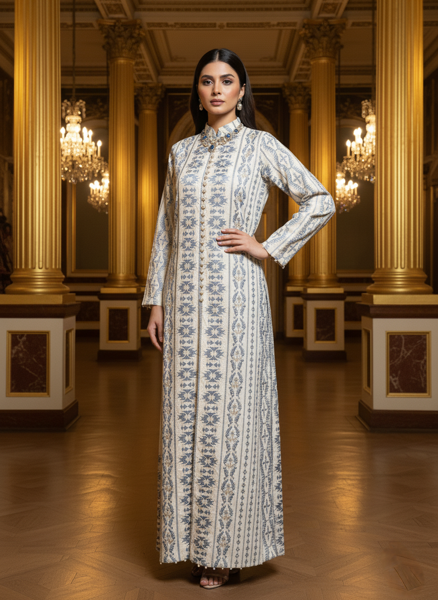 A vision of timeless craftsmanship and modern grace. Each ensemble is an ode to luxury, embroidered with thick textures, intricate embroidery and delicate embellishments, that reflect the essence of refined elegance. This jacket celebrates artistry, confidence and the luminous beauty of formal wear refined!