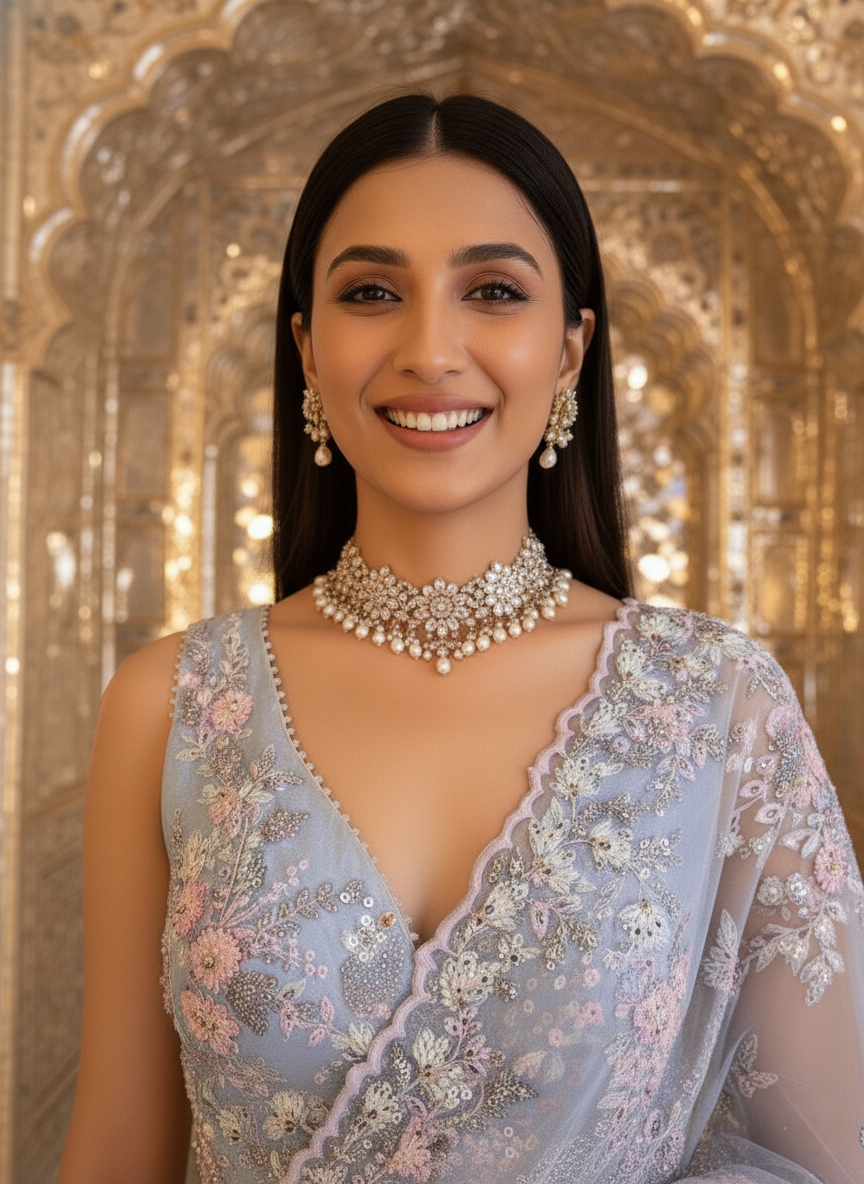 An exquisite powder blue couture sari crafted in fine net, intricately embroidered with pastel floral motifs and hand-finished sequin detailing. The ethereal drape captures timeless grace, while the scalloped, delicately beaded border lends a touch of regal refinement. Paired with a meticulously embellished blouse, this ensemble embodies sophistication and romance — a perfect choice for elevated soirées, receptions, or modern-day celebrations steeped in tradition