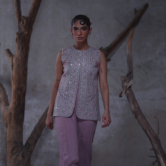 Make a statement in our organza jacket, crafted with modern luxury. It is embellished with intricate cutwork embroidery. A touch of pearls and sequins adds a touch of elegance to this ensemble. It has a shimmering sequins inner and crushed chiffon pants.