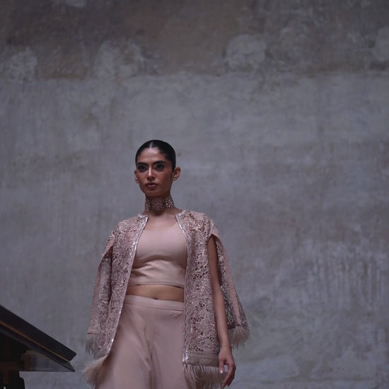 Indulge in the ultimate luxury in our embroidered jacket, featuring elaborate cutwork details and elegant cape sleeves. Adorned with delicate lace and luxurious fur, this piece exudes sophistication and grace. Pair it with an inner and a pair of flared chiffon gharara pants for a complete look!