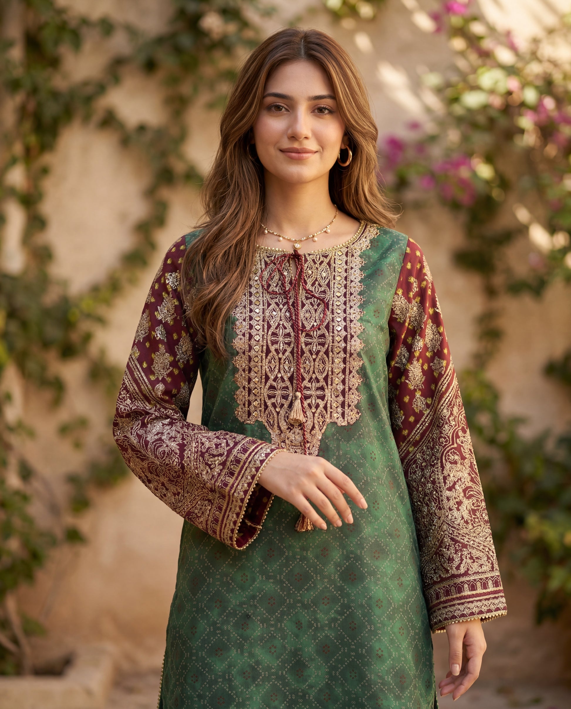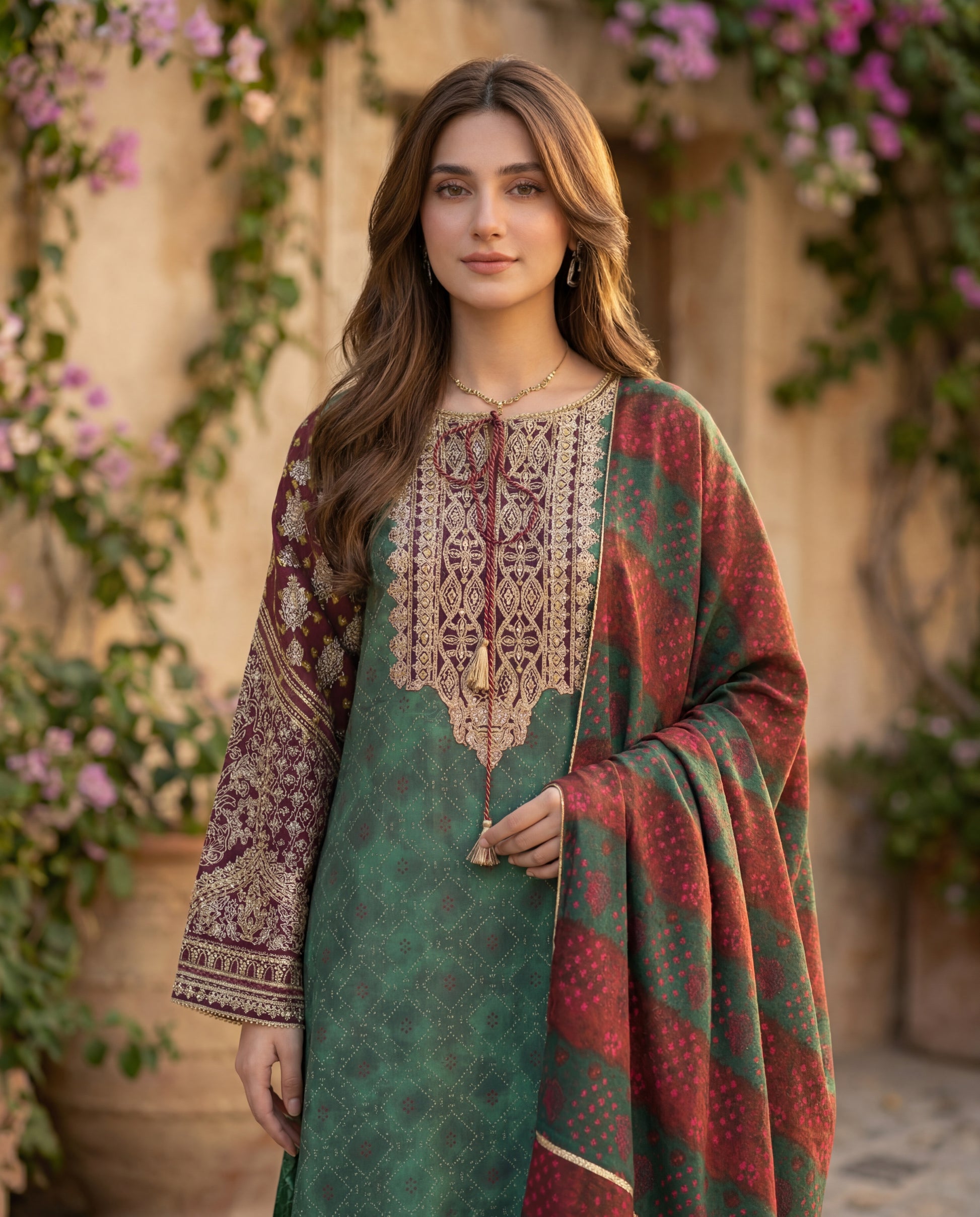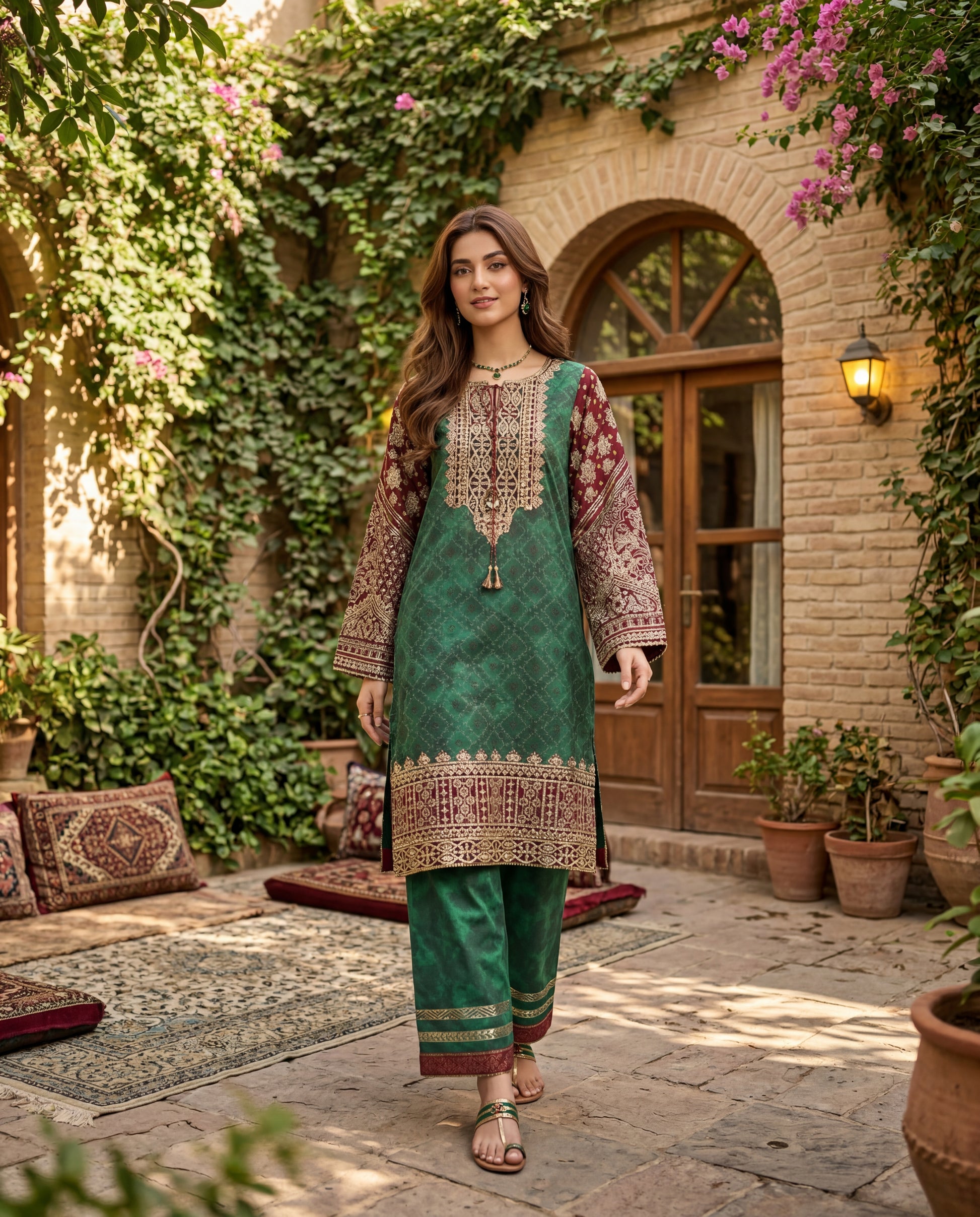 A timeless green kurta set crafted in luxurious viscose dupion, highlighted with intricate gold and maroon detailing for a regal finish. Paired with matching pants and a soft viscose dupatta, this ensemble brings effortless sophistication to festive dressing.