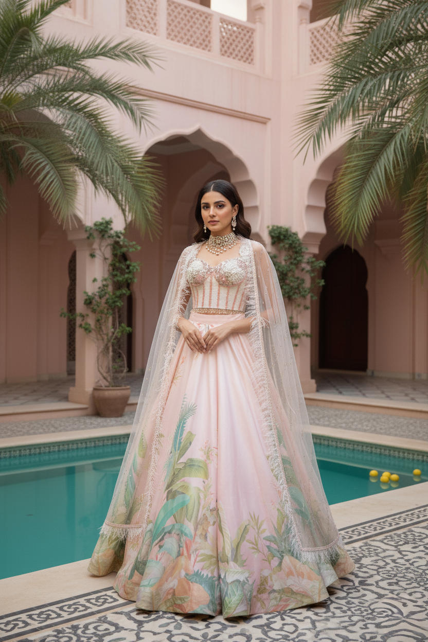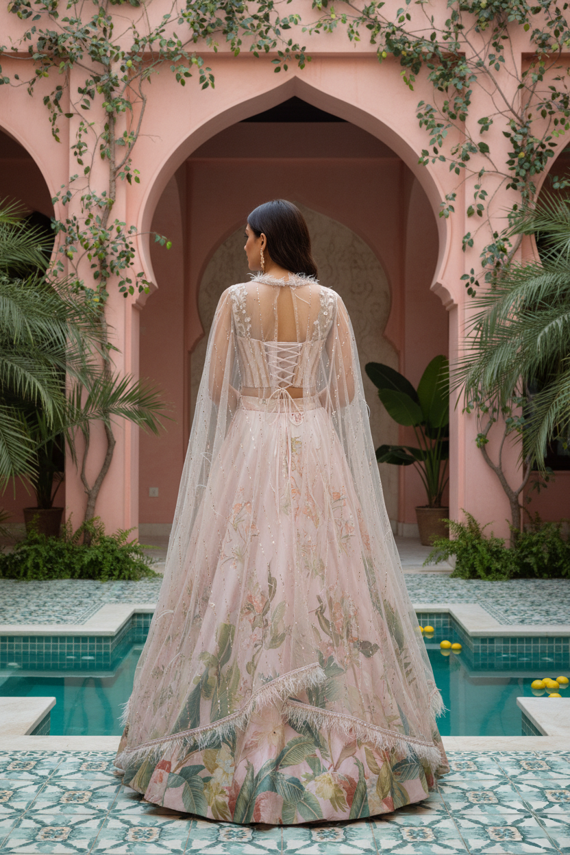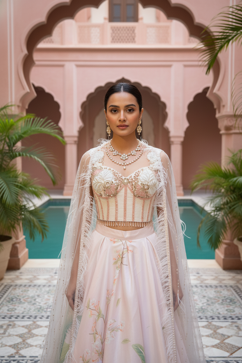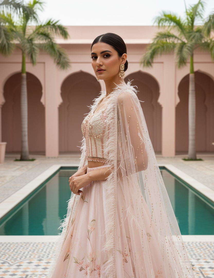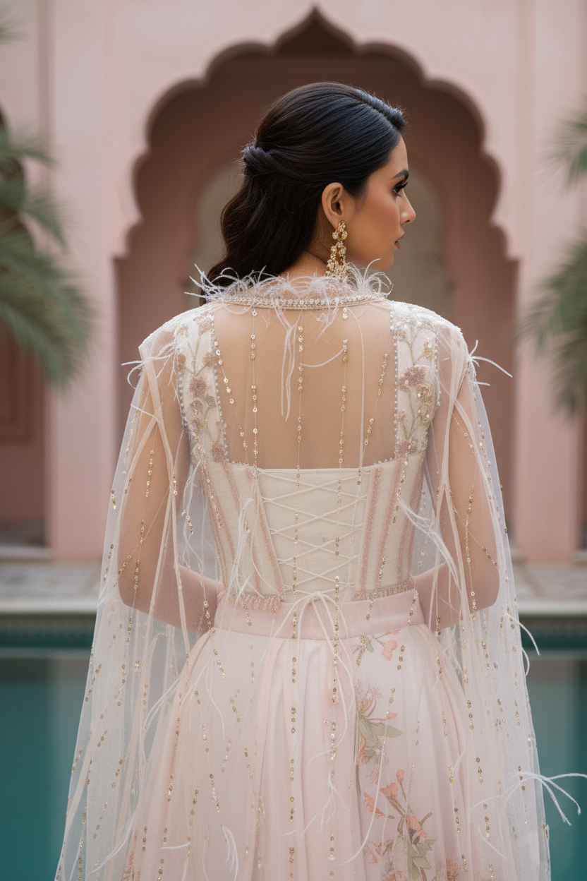 An ethereal expression of modern couture, this blush pink ensemble embodies quiet grandeur and romantic artistry. The corset style blouse, crafted in delicate net and encrusted with pearls, sequins, and tonal beadwork, is framed by a gossamer cape that drapes effortlessly over the shoulders its feathered edges and pearl accents lending a whisper of fantasy.The voluminous viscose silk skirt unfurls in soft pastel tones, brought to life with hand-rendered botanical motifs and fine embroidery that glimmers subtly under light. Graceful and poetic, this look reimagines traditional Indian craftsmanship through a lens of contemporary elegance. Designed for the woman who commands attention with grace, this ensemble is an ode to ethereal femininity and timeless sophistication.