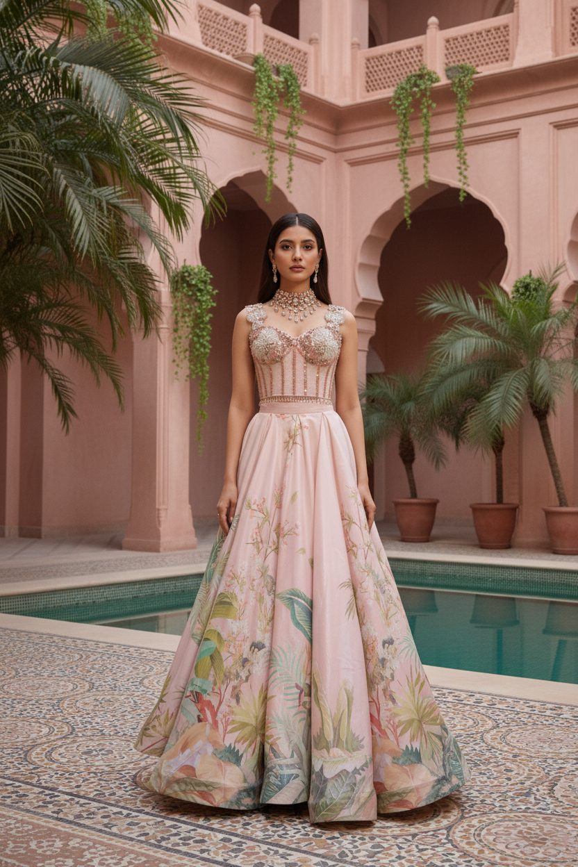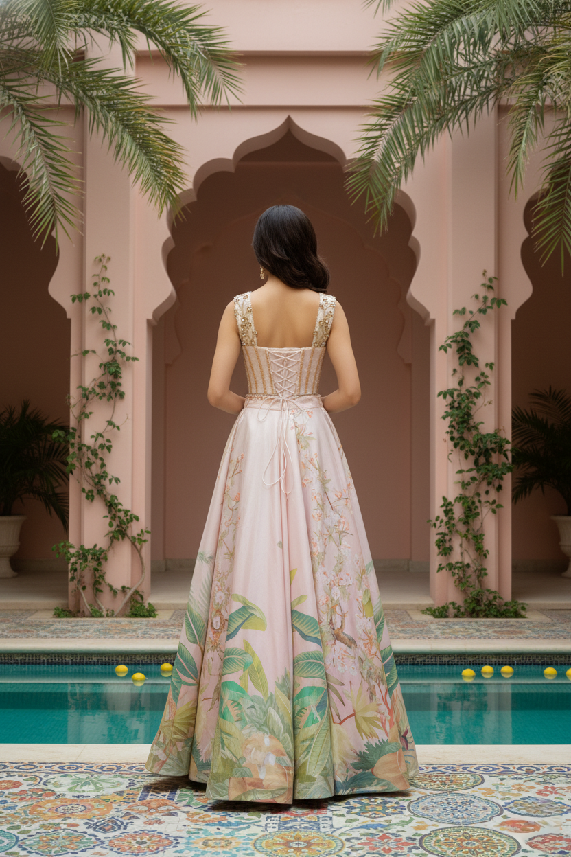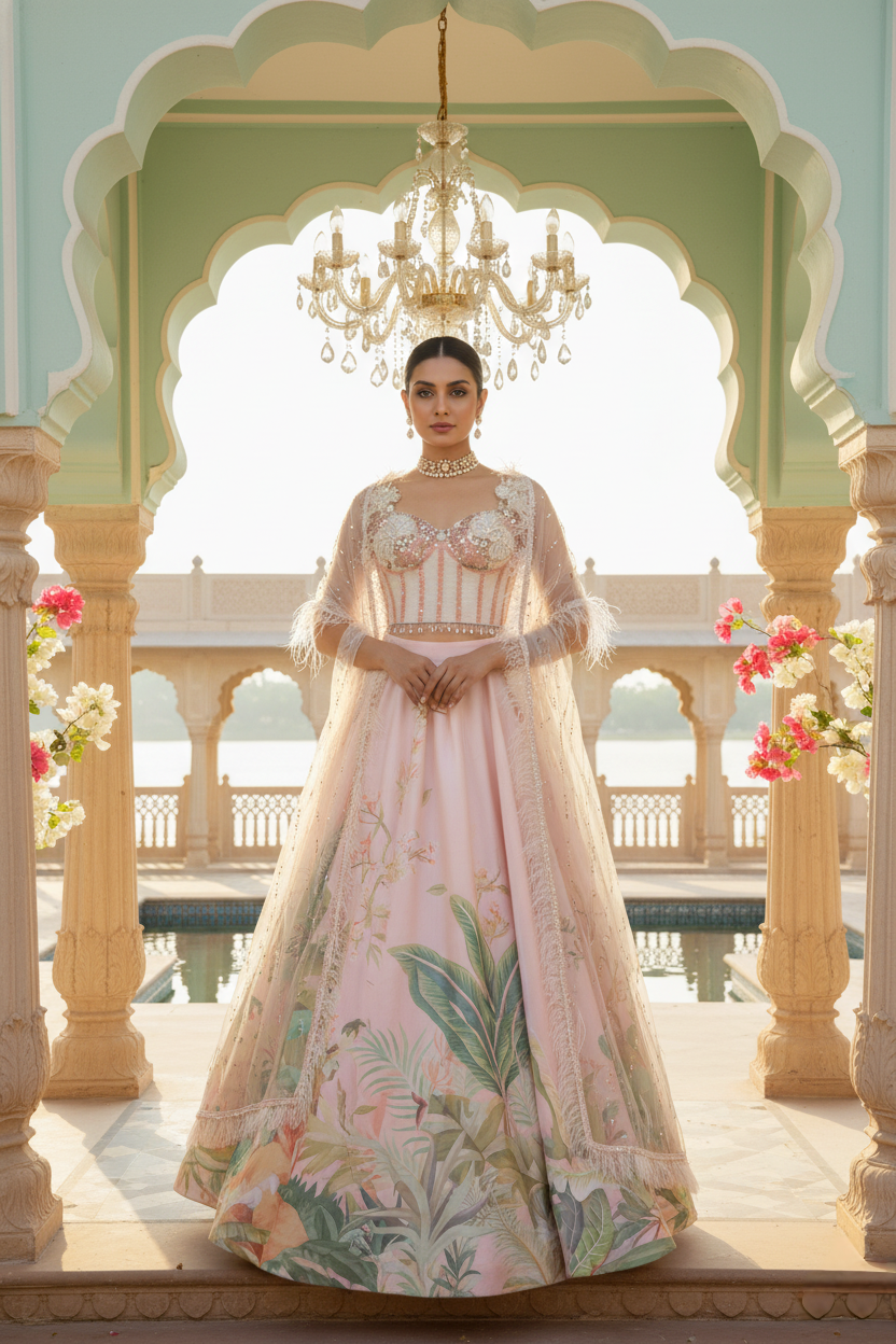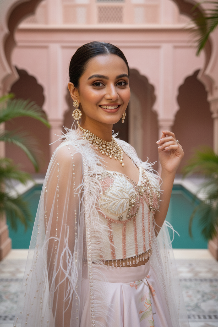 An ethereal expression of modern couture, this blush pink ensemble embodies quiet grandeur and romantic artistry. The corset style blouse, crafted in delicate net and encrusted with pearls, sequins, and tonal beadwork, is framed by a gossamer cape that drapes effortlessly over the shoulders its feathered edges and pearl accents lending a whisper of fantasy.The voluminous viscose silk skirt unfurls in soft pastel tones, brought to life with hand-rendered botanical motifs and fine embroidery that glimmers subtly under light. Graceful and poetic, this look reimagines traditional Indian craftsmanship through a lens of contemporary elegance. Designed for the woman who commands attention with grace, this ensemble is an ode to ethereal femininity and timeless sophistication.