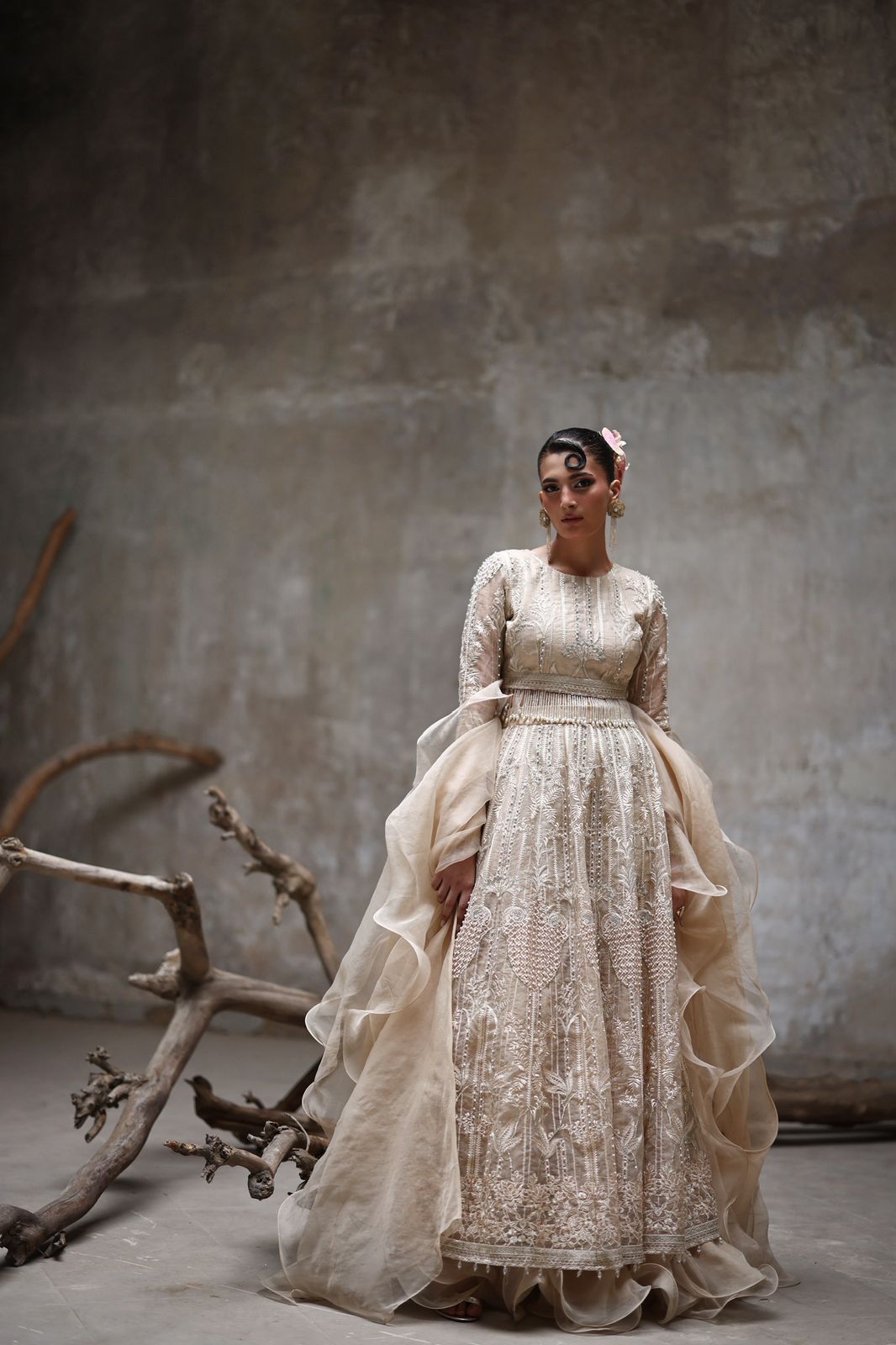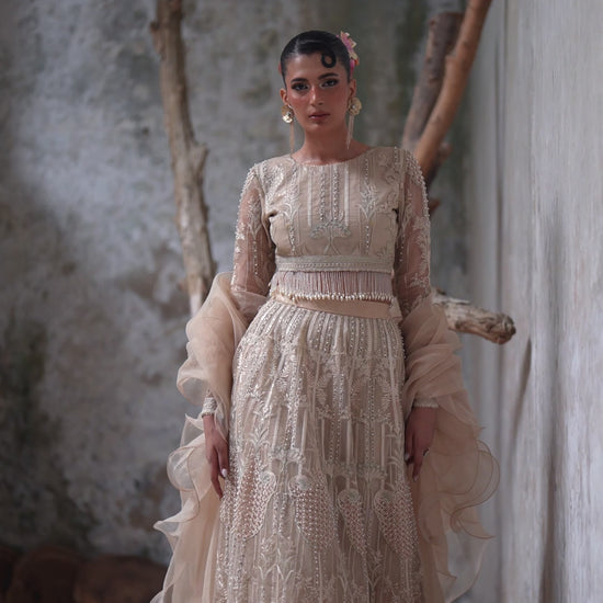 Elevate your elegance in our stunning organza embroidered blouse that captivates intricate cutwork details and celestial mirrors, all beautifully embellished with sequins and tassels. This enchanting ensemble pairs perfectly with our luxurious ghagra that is adorned with delicate borders, embellished with tikki stones and pearls. This ensemble will ensure that you make a statement at any occasion!