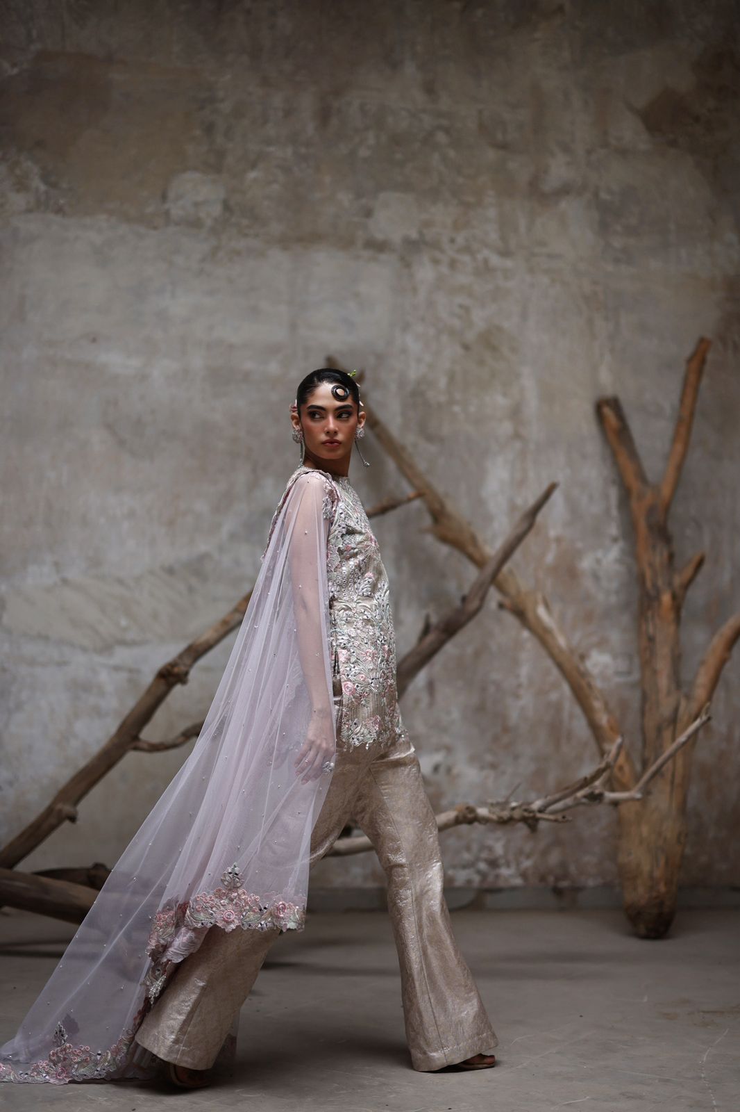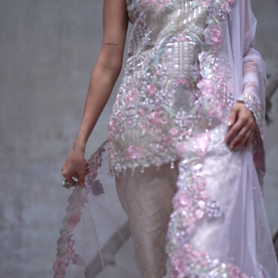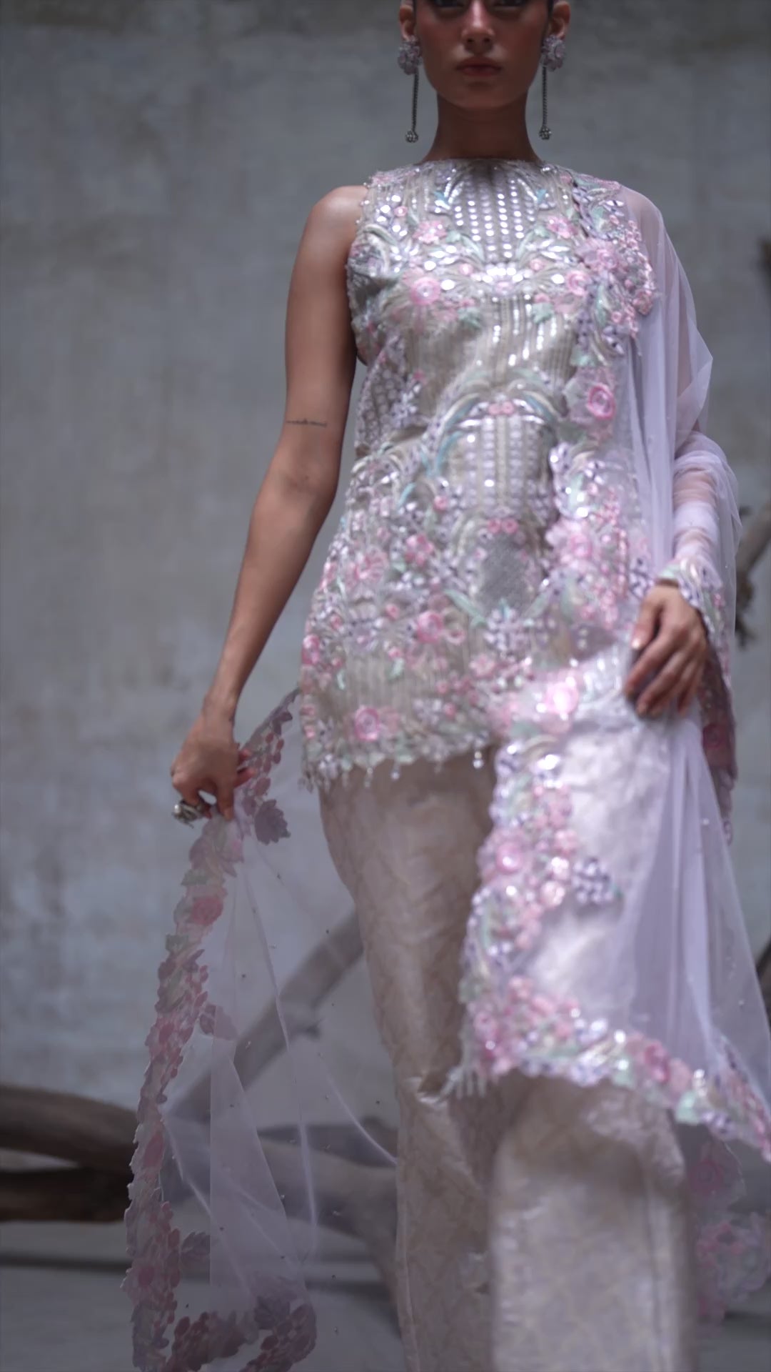 Our exquisite embroidered kurta, features floral embroidery, mesmerising cutwork details, celestial mirrors embellished with sequins and tassels that add a touch of artistry to your ensemble! A floral embroidered dupatta enhances its charm. It goes very well with a pair of brocade pants.