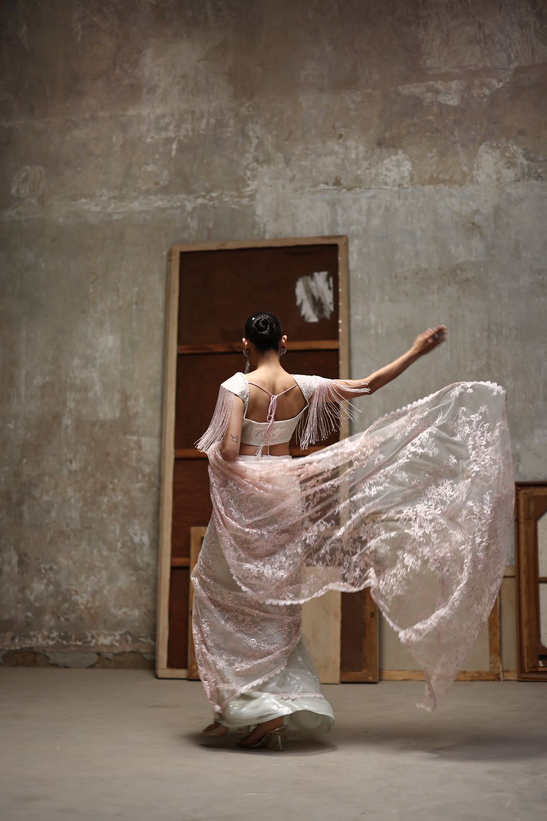 Step u to the world of modern luxury in our net embroidered blouse and sari, it is a true piece of art, embellished with crystals and sequins that shimmer and shine with every movement! The addition of tassels gives this ensemble a playful and elegant touch!