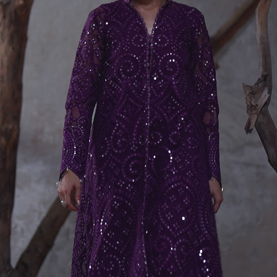 A captivating allure in a realm of lavishness and refinement in our stunning organza, embroidered jacket. It is complemented with a chiffon, crushed pallazo in a bold hue. Through a seamless fusion of opulence and heritage, this garment is adorned with shimmering sequins, cut dana and tassels. This ensemble exudes grace and exemplifies couture fashion!